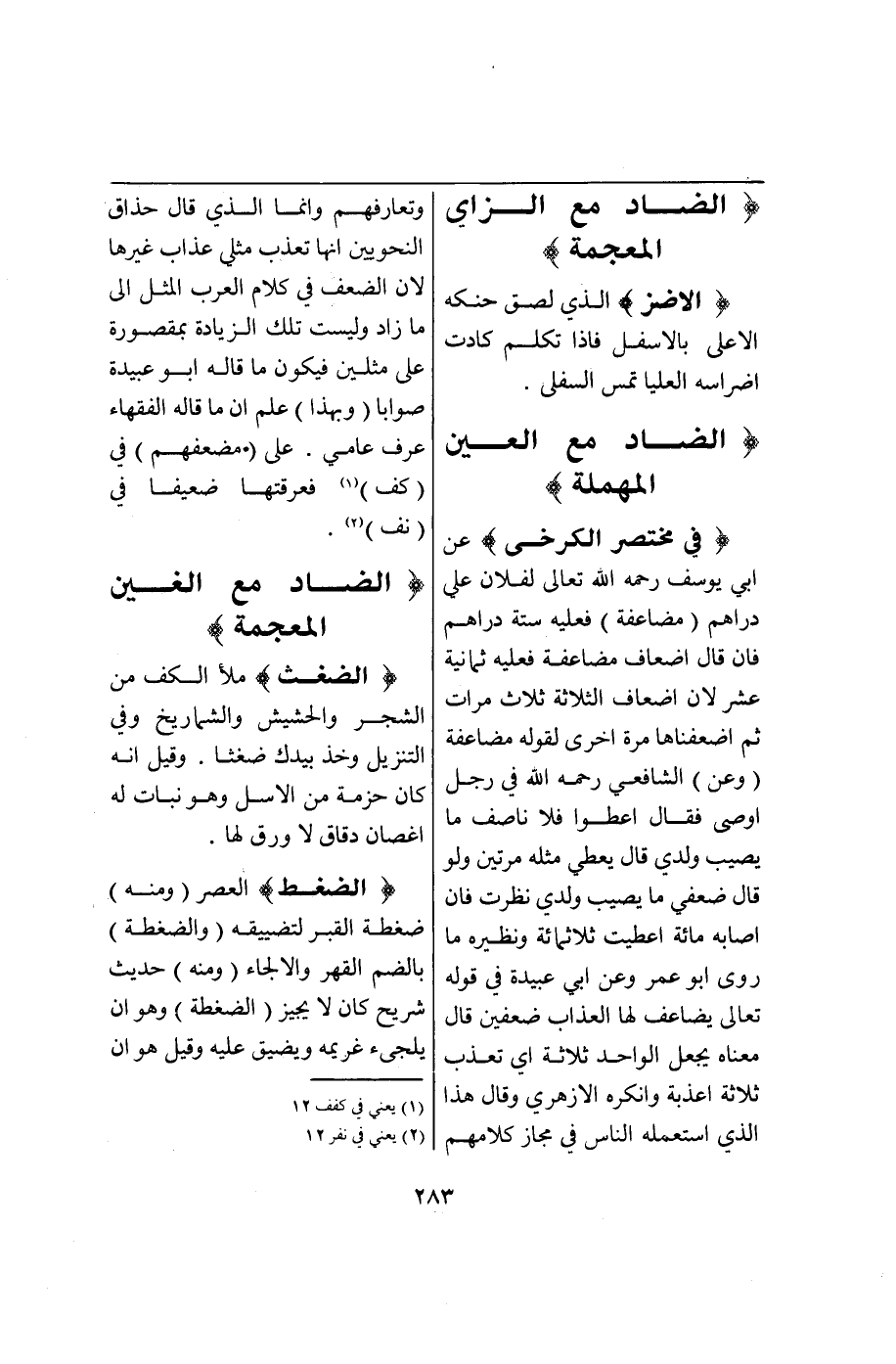 (ض ع ف) : (فِي مُخْتَصَرِ الْكَرْخِيِّ) عَنْ أَبِي يُوسُفَ - رَحِمَهُ اللَّهُ تَعَالَى - لِفُلَانٍ عَلَيَّ دَرَاهِمُ (مُضَاعَفَةٌ) فَعَلَيْهِ سِتَّةُ دَرَاهِمَ فَإِنْ قَالَ أَضْعَافٌ مُضَاعَفَةٌ فَعَلَيْهِ ثَمَانِيَةَ عَشَرَ لِأَنَّ ضِعْفَ الثَّلَاثَةِ ثَلَاثَةُ ثَلَاثٍ ثُمَّ أَضْعَفْنَاهَا مَرَّةً أُخْرَى لِقَوْلِهِ مُضَاعَفَةٌ (وَعَنْ) الشَّافِعِيِّ - رَحِمَهُ اللَّهُ - فِي رَجُلٍ أَوْصَى فَقَالَ أَعْطُوا فُلَانًا ضِعْفَ مَا يُصِيبُ وَلَدِي قَالَ يُعْطَى مِثْلَهُ مَرَّتَيْنِ وَلَوْ قَالَ ضِعْفَيْ مَا يُصِيبُ وَلَدِي نَظَرْتَ فَإِنْ أَصَابَهُ مِائَةٌ أَعْطَيْتَ ثَلَاثَمِائَةٍ وَنَظِيرُهُ مَا رَوَى أَبُو عَمْرٍو وَعَنْ أَبِي عُبَيْدَةَ فِي قَوْله تَعَالَى {يُضَاعَفْ لَهَا الْعَذَابُ ضِعْفَيْنِ} [الأحزاب: 30] قَالَ مَعْنَاهُ يُجْعَلُ الْوَاحِدُ ثَلَاثَةً أَيْ تُعَذَّبْ ثَلَاثَةَ أَعْذِبَةٍ وَأَنْكَرَهُ الْأَزْهَرِيُّ وَقَالَ هَذَا الَّذِي اسْتَعْمَلَهُ النَّاسُ فِي مَجَازِ كَلَامِهِمْ وَتَعَارُفِهِمْ وَإِنَّمَا الَّذِي قَالَ حُذَّاقُ النَّحْوِيِّينَ إنَّهَا تُعَذَّبُ مِثْلَيْ عَذَابِ غَيْرِهَا لِأَنَّ الضِّعْفَ فِي كَلَامِ الْعَرَبِ الْمِثْلُ إلَى مَا زَادَ وَلَيْسَتْ تِلْكَ الزِّيَادَةُ بِمَقْصُورَةٍ عَلَى مِثْلَيْنِ فَيَكُونُ مَا قَالَهُ أَبُو عُبَيْدَةَ صَوَابًا (وَبِهَذَا) عُلِمَ أَنَّ
