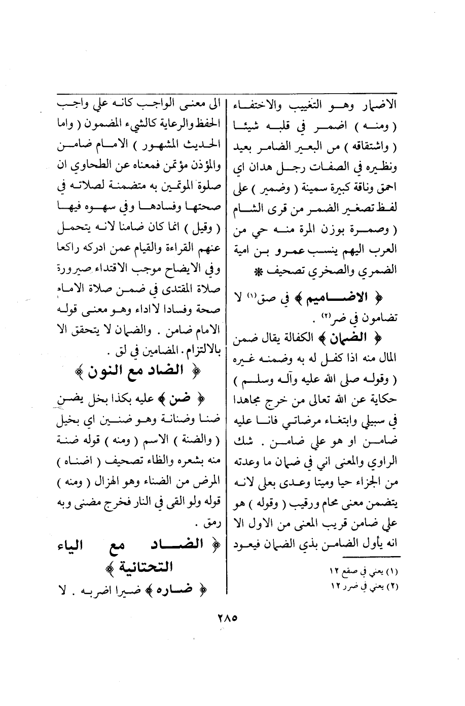 (ض م م) : (الْأَضَامِيمُ) فِي ص ق لَا تُضَامُونَ فِي ض ر ضُمِنَ: (الضَّمَانُ) الْكَفَالَةُ يُقَالُ ضَمِنَ الْمَالَ مِنْهُ إذَا كَفَلَ لَهُ بِهِ وَضَمَّنَهُ غَيْرَهُ (وَقَوْلُهُ - صَلَّى اللَّهُ عَلَيْهِ وَآلِهِ وَسَلَّمَ -) حِكَايَةً عَنْ اللَّهِ تَعَالَى «مَنْ خَرَجَ مُجَاهِدًا فِي سَبِيلِي وَابْتِغَاءَ مَرْضَاتِي فَأَنَا عَلَيْهِ ضَامِنٌ أَوْ هُوَ عَلَيَّ ضَامِنٌ» شَكَّ الرَّاوِي وَالْمَعْنَى إنِّي فِي ضَمَانِ مَا وَعَدْتُهُ مِنْ الْجَزَاءِ حَيًّا وَمَيِّتًا وَعُدِّيَ بِعَلَى لِأَنَّهُ يَتَضَمَّنُ مَعْنَى مُحَامٍ وَرَقِيبٍ (وَقَوْلُهُ) هُوَ عَلَيَّ ضَامِنٌ قَرِيبُ الْمَعْنَى مِنْ الْأَوَّلِ إلَّا أَنَّهُ يُؤَوَّلُ الضَّامِنُ بِذِي الضَّمَانِ فَيَعُودُ إلَى مَعْنَى الْوَاجِبِ كَأَنَّهُ عَلَيَّ وَاجِبُ الْحِفْظِ وَالرِّعَايَةِ كَالشَّيْءِ الْمَضْمُونِ (وَأَمَّا الْحَدِيثُ الْمَشْهُورُ) «الْإِمَامُ ضَامِنٌ وَالْمُؤَذِّنُ مُؤْتَمَنٌ» فَمَعْنَاهُ عَنْ الطَّحَاوِيِّ أَنَّ صَلَاةَ الْمُؤْتَمِّينَ بِهِ مُتَضَمِّنَةٌ لِصَلَاتِهِ فِي صِحَّتِهَا وَفَسَادِهَا وَفِي سَهْوِهِ فِيهَا (وَقِيلَ) إنَّمَا كَانَ ضَامِنًا لِأَنَّهُ يَتَحَمَّلُ عَنْهُمْ الْقِرَاءَةَ وَالْقِيَامَ عَمَّنْ أَدْرَكَهُ رَاكِعًا وَفِي الْإِيضَاحِ مُوجِبُ الِاقْتِدَاءِ صَيْرُورَةُ صَلَاةِ الْمُقْتَدِي فِي