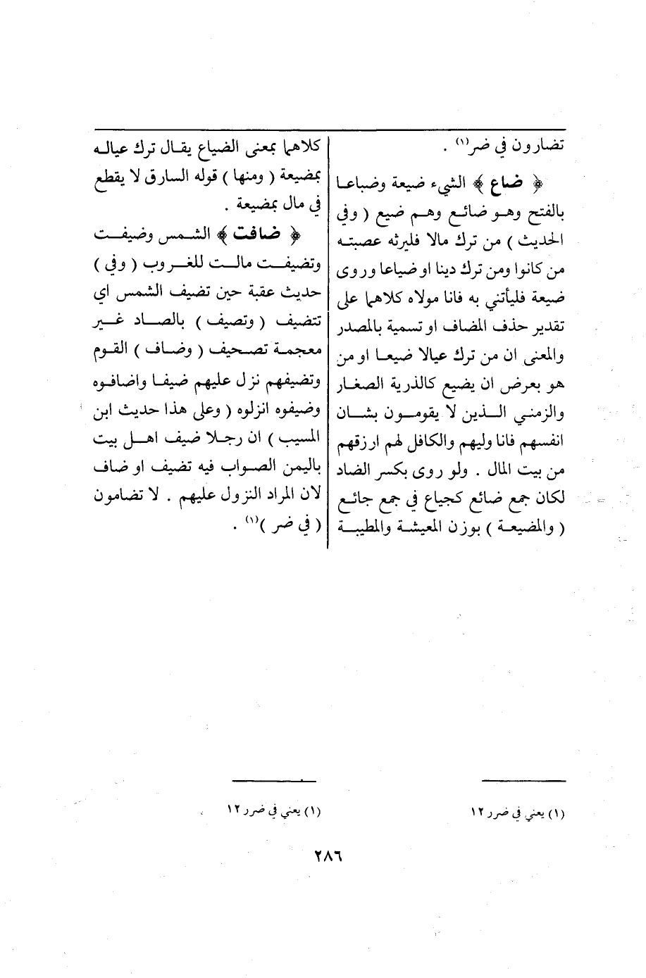 (ض ي ع) : (ضَاعَ) الشَّيْءُ ضَيْعَةً وَضَيَاعًا بِالْفَتْحِ وَهُوَ ضَائِعٌ وَهُمْ ضُيَّعٌ وَفِي الْحَدِيثِ «مَنْ تَرَكَ مَالًا فَلْيَرِثْهُ عَصَبَتُهُ مَنْ كَانُوا وَمَنْ تَرَكَ دَيْنًا أَوْ ضَيَاعًا وَرُوِيَ ضَيْعَةً فَلْيَأْتِنِي بِهِ فَأَنَا مَوْلَاهُ» كِلَاهُمَا عَلَى تَقْدِيرِ حَذْفِ الْمُضَافِ أَوْ تَسْمِيَةٌ بِالْمَصْدَرِ وَالْمَعْنَى أَنْ مَنْ تَرَكَ عِيَالًا ضُيَّعًا أَوْ مَنْ هُوَ بِعَرَضِ أَنْ يَضِيعَ كَالذُّرِّيَّةِ الصِّغَارِ وَالزَّمْنَى الَّذِينَ لَا يَقُومُونَ بِشَأْنِ أَنْفُسِهِمْ فَأَنَا وَلِيُّهُمْ وَالْكَافِلُ لَهُمْ أَرْزُقُهُمْ مِنْ بَيْتِ الْمَالِ وَلَوْ رُوِيَ بِكَسْرِ الضَّادِ لَكَانَ جَمْعَ ضَائِعٍ كَجِيَاعٍ فِي جَمْعِ جَائِعٍ وَالْمَضِيعَةُ