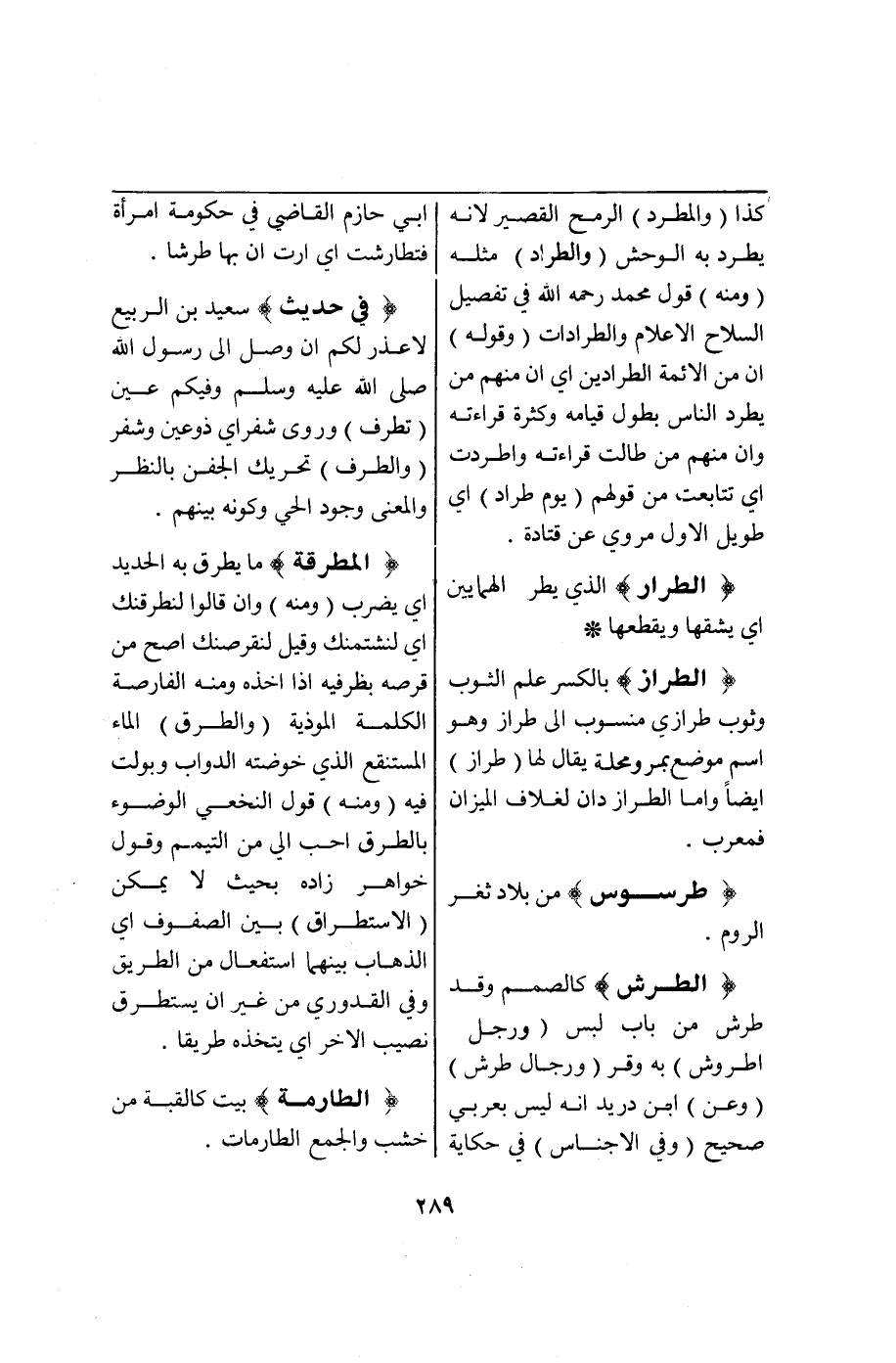 (ط ر د) : (الطَّرْدُ) الْإِبْعَادُ وَالتَّنْحِيَةُ يُقَالُ طَرَدَهُ إذَا نَحَّاهُ وَأَطْرَدَهُ السُّلْطَانُ جَعَلَهُ طَرِيدًا لَا يَأْمَنُ وَقَوْلُهُ لَا بَأْسَ بِالسِّبَاقِ مَا لَمْ تَطْرُدْهُ وَيُطْرِدْكَ (قَالَ) أَبُو عُبَيْدٍ الْإِطْرَادُ أَنْ تَقُولَ إنْ سَبَقْتَنِي فَلَكَ عَلَيَّ كَذَا وَإِنْ سَبَقْتُكَ فَلِي عَلَيْكَ كَذَا (وَالْمِطْرَدُ) الرُّمْحُ الْقَصِيرُ لِأَنَّهُ يُطْرَدُ بِهِ الْوَحْشُ (وَالطِّرَّادُ) مِثْلُهُ (وَمِنْهُ) قَوْلُ مُحَمَّدٍ - رَحِمَهُ اللَّهُ - فِي تَفْصِيلِ السِّلَاحِ الْأَعْلَامُ وَالطِّرَادَاتُ (وَقَوْلُهُ) إنَّ مِنْ الْأَئِمَّةِ الطَّرَّادِينَ أَيْ إنَّ مِنْهُمْ مَنْ يَطْرُدُ النَّاسَ بِطُولِ قِيَامِهِ وَكَثْرَةِ قِرَاءَتِهِ وَإِنَّ مِنْهُمْ مَنْ طَالَتْ قِرَاءَتُهُ وَاطَّرَدَتْ أَيْ تَتَابَعَتْ مِنْ قَوْلِهِمْ (يَوْمٌ طَرَّادٌ) أَيْ طَوِيلُ الْأَوَّلِ مَرْوِيٌّ عَنْ قَتَادَةَ.