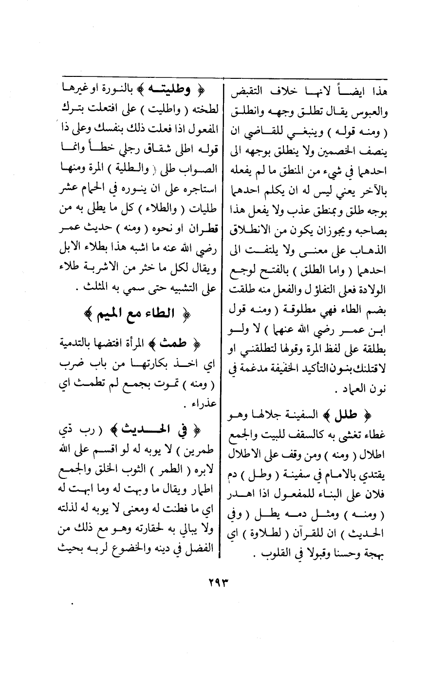 (ط ل ل) : (طَلَلُ) السَّفِينَةِ جِلَالُهَا وَهُوَ غِطَاءٌ تُغَشَّى بِهِ كَالسَّقْفِ لِلْبَيْتِ وَالْجَمْعُ أَطْلَالٌ (وَمِنْهُ) وَمَنْ وَقَفَ عَلَى الْأَطْلَالِ يَقْتَدِي بِالْإِمَامِ فِي سَفِينَةٍ (وَطُلَّ) دَمُ فُلَانٍ عَلَى الْبِنَاءِ لِلْمَفْعُولِ إذَا أُهْدِرَ (وَمِنْهُ) وَمِثْلُ دَمِهِ يُطَلُّ طلو (وَفِي الْحَدِيثِ) إنَّ لِلْقُرْآنِ (لَطَلَاوَةً) أَيْ بَهْجَةً وَحُسْنًا وَقَبُولًا فِي الْقُلُوبِ.