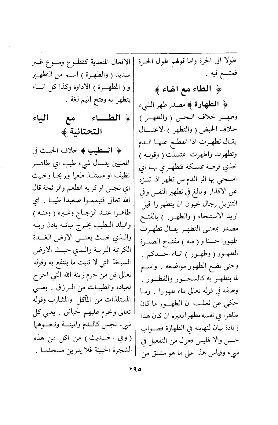 (ط هـ ر) : (الطَّهَارَةُ) مَصْدَرُ طَهُرَ الشَّيْءُ وَطَهُرَ خِلَافُ نَجِسَ (وَالطُّهْرُ) خِلَافُ الْحَيْضِ (وَالتَّطَهُّرُ) الِاغْتِسَالُ يُقَالُ طَهُرَتْ إذَا انْقَطَعَ عَنْهَا الدَّمُ وَتَطَهَّرَتْ وَاطَّهَّرَتْ اغْتَسَلَتْ (وَقَوْلُهُ) «خُذِي فِرْصَةً مُمَسَّكَةً فَتَطَهَّرِي بِهَا» أَيْ امْسَحِي بِهَا أَثَرَ الدَّمِ مِنْ تَطَهَّرَ إذَا تَنَزَّهَ عَنْ الْأَقْذَارِ وَبَالَغَ فِي تَطْهِيرِ النَّفْسِ وَفِي التَّنْزِيلِ {رِجَالٌ يُحِبُّونَ أَنْ يَتَطَهَّرُوا} [التوبة: 108] قِيلَ أُرِيدَ الِاسْتِنْجَاءُ (وَالطَّهُورُ) بِالْفَتْحِ مَصْدَرٌ بِمَعْنَى التَّطَهُّرِ يُقَالُ تَطَهَّرْت طَهُورًا حَسَنًا وَ (مِنْهُ) «مِفْتَاحُ الصَّلَاةِ الطَّهُورُ» (وَطَهُورُ) إنَاءِ أَحَدِكُمْ وَحَتَّى يَضَعَ الطَّهُورَ مَوْضِعَهُ وَاسْمٌ لِمَا يُتَطَهَّرُ بِهِ كَالسَّحُورِ وَالْفَطُورِ وَصِفَةٌ فِي قَوْله تَعَالَى {مَاءً طَهُورًا} [الفرقان: 48] وَمَا حُكِيَ عَنْ ثَعْلَبٍ إنَّ الطَّهُورَ مَا كَانَ طَاهِرًا فِي نَفْسِهِ مُطَهِّرًا لِغَيْرِهِ إنْ كَانَ هَذَا زِيَادَةَ بَيَانٍ لِنِهَايَتِهِ فِي الطَّهَارَةِ فَصَوَابٌ حَسَنٌ وَإِلَّا فَلَيْسَ فَعُولٌ مِنْ التَّفْعِيلِ فِي شَيْءٍ وَقِيَاسُ هَذَا عَلَى مَا هُوَ مُشْتَقٌّ مِنْ الْأَفْعَالِ الْمُتَعَدِّيَةِ كَقَطُوعٍ وَمَنُوعٍ غَيْرُ سَدِيدٍ (وَالطُّهْرَةُ) اسْمٌ مِنْ التَّطْهِيرِ وَ (الْمِطْهَرَةُ) الْإِدَاوَةُ وَكَذَا كُلُّ إنَاءٍ يُتَطَهَّرُ بِهِ وَفَتْحُ الْمِيمِ لُغَةٌ.