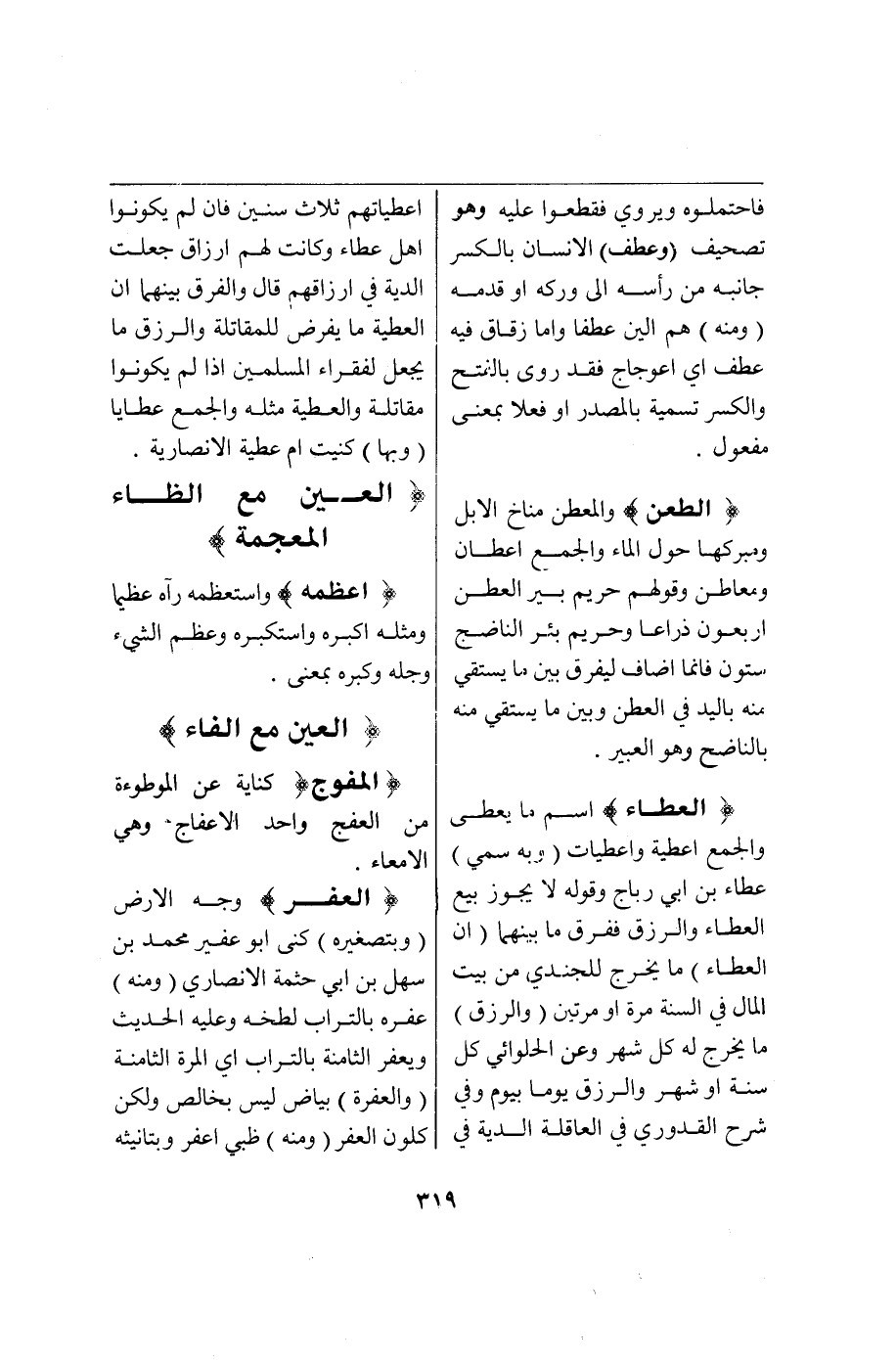 (ع ط ف) : (عَطَفَهُ) عَطْفًا أَمَالَهُ وَاسْتَعْطَفَهُ كَذَلِكَ وَمِنْهُ اسْتَعْطَفَ نَاقَتَهُ أَيْ عَطَفَهَا بِأَنْ جَذَبَ زِمَامَهَا لِتُمِيلَ رَأْسَهَا وَعَطَفَ بِنَفْسِهِ عُطُوفًا (وَمِنْهُ) قَوْلُهُ فِي الدِّيَات فَإِنْ عَطَفَتْ يَمِينًا وَشِمَالًا أَيْ انْعَطَفَتْ وَمَالَتْ (وَقَوْلُهُمْ) عَطَفَ عَلَيْهِ بِمَعْنَى رَحِم مِنْ ذَلِكَ لِأَنَّ فِي الرَّحْمَةِ مَيْلًا وَانْعِطَافًا إلَى الْمَرْحُوم (وَمِنْهُ) حَدِيثُ الْحَارِثِ فَعَطَفُوا عَلَيْهِ أَيْ رَحِمُوهُ فَاحْتَمَلُوهُ وَيُرْوَى فَفَظِعُوا عَلَيْهِ وَهُوَ تَصْحِيفٌ (وَعِطْفُ) الْإِنْسَانِ بِالْكَسْرِ جَانِبُهُ مِنْ رَأْسِهِ إلَى وَرِكِهِ أَوْ قَدَمِهِ (وَمِنْهُ) هُمْ أَلْيَنُ عِطْفًا وَأَمَّا زُقَاقٌ فِيهِ عِطْفٌ أَيْ اعْوِجَاج فَقَدْ رُوِيَ بِالْفَتْحِ وَالْكَسْر تَسْمِيَةً بِالْمَصْدَرِ أَوْ فِعْلًا بِمَعْنَى مَفْعُول.