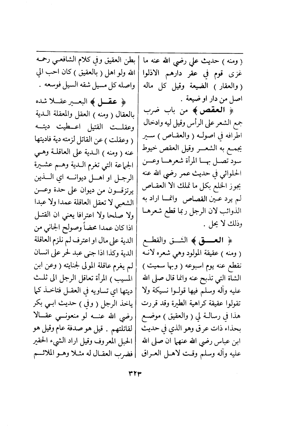 (ع ق ق) : (الْعَقُّ) الشَّقُّ وَالْقَطْعُ (وَمِنْهُ) عَقِيقَةُ الْمَوْلُودِ وَهِيَ شَعْرُهُ لِأَنَّهُ يُقْطَعُ عَنْهُ يَوْمَ أُسْبُوعِهِ (وَبِهَا سُمِّيَتْ) الشَّاةُ الَّتِي تُذْبَحُ عَنْهُ وَإِنَّمَا قَالَ - صَلَّى اللَّهُ عَلَيْهِ وَآلِهِ وَسَلَّمَ - فِيهَا «قُولُوا نَسِيكَةً وَلَا تَقُولُوا عَقِيقَةً» كَرَاهِيَة الطِّيَرَةِ وَقَدْ قَرَّرْتُ هَذَا فِي رِسَالَةٍ لِي (وَالْعَقِيقُ) مَوْضِعٌ بِحِذَاءِ ذَاتِ عِرْقٍ وَهُوَ الَّذِي فِي حَدِيثِ ابْنِ عَبَّاسٍ - رَضِيَ اللَّهُ عَنْهُمَا - أَنَّهُ - صَلَّى اللَّهُ عَلَيْهِ وَآلِهِ وَسَلَّمَ - «وَقَّتَ لِأَهْلِ الْعِرَاقِ بَطْنَ الْعَقِيقِ» وَفِي كَلَامِ الشَّافِعِيِّ - رَحِمَهُ اللَّهُ - وَلَوْ أَهَلَّ (بِالْعَقِيقِ) كَانَ أَحَبُّ إلَيَّ وَأَصْلُهُ كُلُّ مَسِيلٍ شَقَّهُ السَّيْلُ فَوَسَّعَهُ.