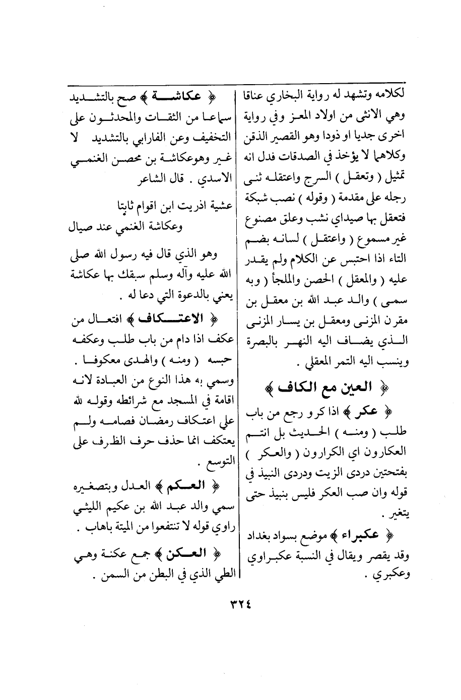 (ع ك ش) : (عُكَّاشَةُ) صَحَّ بِالتَّشْدِيدِ سَمَاعًا مِنْ الثِّقَاتِ، وَالْمُحَدِّثُونَ عَلَى التَّخْفِيف وَعَنْ الْفَارَابِيِّ بِالتَّشْدِيدِ لَا غَيْرُ وَهُوَ عُكَّاشَةُ بْنُ مِحْصَنٍ الْغَنْمِيُّ الْأَسَدِيُّ قَالَ الشَّاعِر