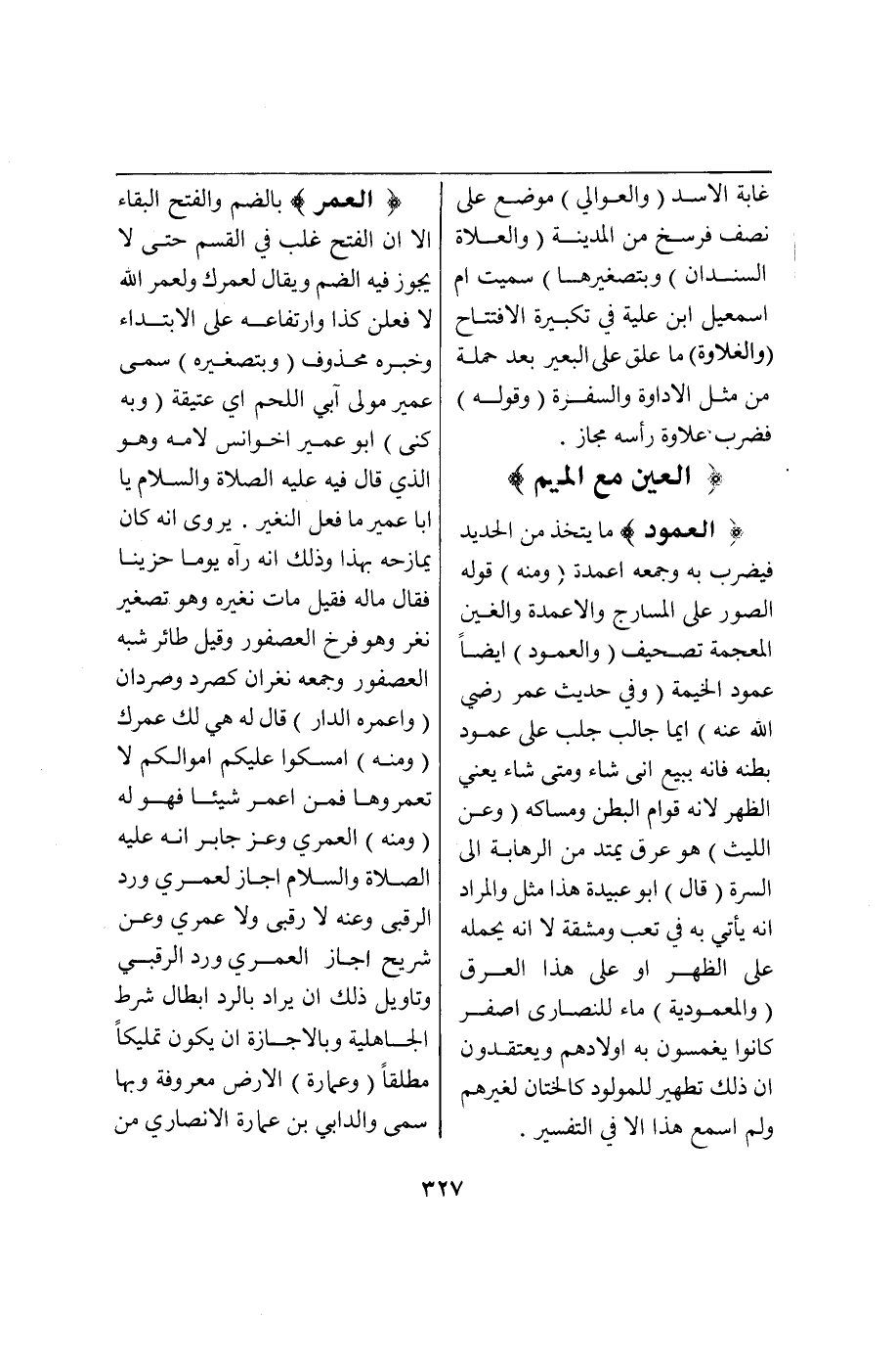 (ع م د) : (الْعَمُودُ) مَا يُتَّخَذُ مِنْ الْحَدِيدِ فَيُضْرَبُ بِهِ وَجَمْعُهُ أَعْمِدَة (وَمِنْهُ) قَوْلُهُ الصُّورَةُ عَلَى الْمَسَارِجِ وَالْأَعْمِدَةِ وَالْغَيْنُ الْمُعْجَمَة تَصْحِيفٌ (وَالْعَمُودُ) أَيْضًا عَمُودُ الْخَيْمَةِ (وَفِي حَدِيثِ عُمَرَ - رَضِيَ اللَّهُ عَنْهُ -) أَيُّمَا جَالِبٍ جَلَبَ عَلَى عَمُودِ بَطْنِهِ فَإِنَّهُ يَبِيعُ أَنَّى شَاءَ وَمَتَى شَاءَ يَعْنِي الظَّهْرَ لِأَنَّهُ قِوَامُ الْبَطْنِ وَمِسَاكُهُ (وَعَنْ اللَّيْثِ) هُوَ عِرْقٌ يَمْتَدُّ مِنْ الرَّهَابَةِ إلَى السُّرَّةِ (قَالَ) أَبُو عُبَيْدٍ هَذَا مَثَلٌ وَالْمُرَادُ أَنَّهُ يَأْتِي بِهِ فِي تَعَبٍ وَمَشَقَّةٍ لَا أَنَّهُ يَحْمِلهُ عَلَى الظَّهْرِ أَوْ عَلَى هَذَا الْعِرْقِ (وَالْمَعْمُودِيَّة) مَاءٌ لِلنَّصَارَى أَصْفَرُ كَانُوا يَغْمِسُونَ بِهِ أَوْلَادَهُمْ وَيَعْتَقِدُونَ أَنَّ ذَلِكَ تَطْهِيرٌ لِلْمَوْلُودِ كَالْخِتَانِ لِغَيْرِهِمْ وَلَمْ أَسْمَع هَذَا إلَّا فِي التَّفْسِيرِ.