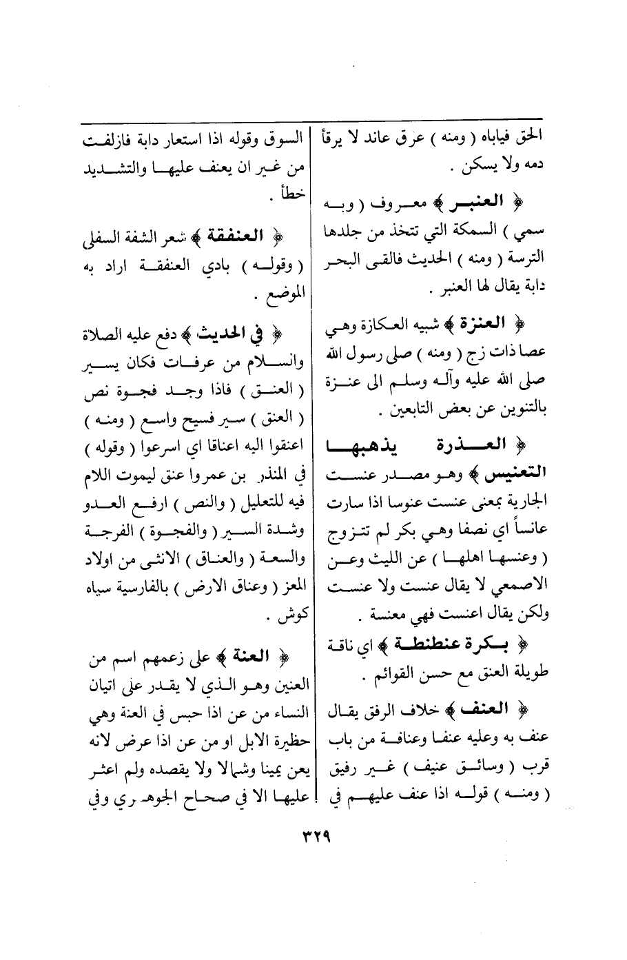 (ع ن ز) : (الْعَنَزَةُ) شَبِيهُ الْعُكَّازَة وَهِيَ عَصَا ذَاتُ زُجٍّ (وَمِنْهُ) صَلَّى رَسُولُ اللَّهِ - صَلَّى اللَّهُ عَلَيْهِ وَآلِهِ وَسَلَّمَ - إلَى عَنَزَةٍ بِالتَّنْوِينِ عَنْ بَعْضِ التَّابِعِينَ.