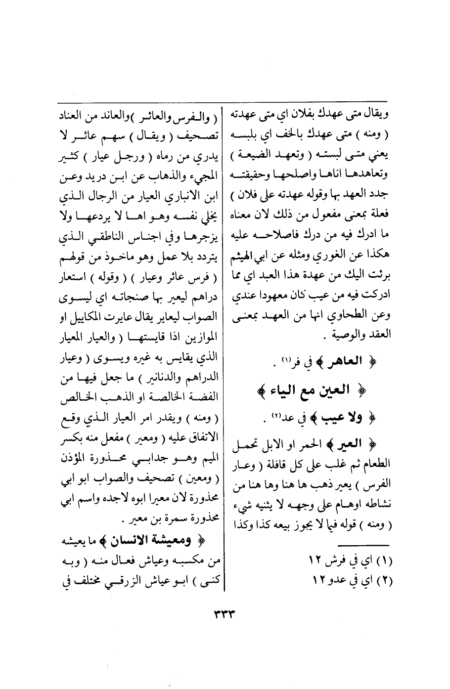 (ع ي ب) : (وَلَا عَيْبَ) فِي ع د عير (الْعِيرُ) الْحُمُرُ أَوْ الْإِبِلُ تَحْمِلُ الطَّعَامَ ثُمَّ غُلِّبَ عَلَى كُلِّ قَافِلَةٍ (وَعَارَ الْفَرَسُ) يَعِيرُ ذَهَبَ هُنَا وَهُنَا مِنْ نَشَاطِهِ أَوْ هَامَ عَلَى وَجْهِهِ لَا يُثْنِيهِ شَيْءٌ (وَمِنْهُ) قَوْلُهُ فِيمَا لَا يَجُوزُ بَيْعُهُ كَذَا وَكَذَا (وَالْفَرَسُ الْعَائِرُ) وَالْعَانِدُ مِنْ الْعِنَادِ تَصْحِيفٌ (وَيُقَالُ) سَهْمٌ عَائِرٌ لَا يُدْرَى مَنْ رَمَاهُ (وَرَجُل عَيَّارٌ) كَثِيرُ الْمَجِيءِ وَالذَّهَابِ