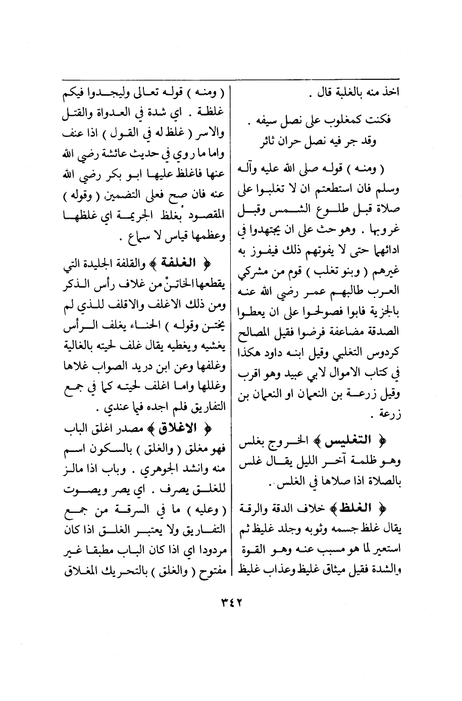 وَقَدْ جَرَّ فِيهِ نَصْلُ حَرَّانَ ثَائِرِ (وَمِنْهُ) قَوْلُهُ - صَلَّى اللَّهُ عَلَيْهِ وَآلِهِ وَسَلَّمَ - «فَإِنْ اسْتَطَعْتُمْ أَنْ لَا تُغْلَبُوا عَلَى صَلَاةٍ قَبْلَ طُلُوعِ الشَّمْسِ وَقَبْلَ غُرُوبِهَا» وَهُوَ حَثٌّ عَلَى أَنْ يَجْتَهِدُوا فِي أَدَائِهِمَا حَتَّى لَا يَفُوتهُمْ ذَلِكَ فَيَفُوزُ بِهِ غَيْرُهُمْ (وَبَنُو تَغْلِب) قَوْمٌ مِنْ مُشْرِكِي الْعَرَبِ طَالَبَهُمْ عُمَرُ - رَضِيَ اللَّهُ عَنْهُ - بِالْجِزْيَةِ فَأَبَوْا فَصُولِحُوا عَلَى أَنْ يُعْطُوا الصَّدَقَةَ مُضَاعَفَةً فَرَفَضُوا فَقِيلَ الْمُصَالِحُ كَرْدُوسٌ التَّغْلِبِيُّ وَقِيلَ ابْنُهُ دَاوُد هَكَذَا فِي كِتَابِ الْأَمْوَالِ لِأَبِي عُبَيْدٍ وَهُوَ أَقْرَبُ وَقِيلَ زُرْعَةُ بْنُ النُّعْمَانَ أَوْ النُّعْمَانُ بْنُ زُرْعَةَ.