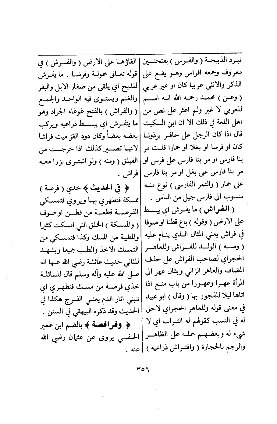 (ف ر س) : (الْفَرْسُ) دَقُّ الْعُنُقِ ثُمَّ صُيِّرَ كُلُّ قَتْلٍ فَرْسًا (وَمِنْهُ) فَرِيسَةُ الْأَسَدِ (وَفِي) الْحَدِيث «نَهَى عَنْ الْفَرْسِ فِي الذَّبْحِ» وَهُوَ أَنْ تَكْسِرَ عَظْمَ الرَّقَبَةِ قَبْلَ أَنْ تَبْرُدَ الذَّبِيحَةُ (وَالْفَرَسُ) بِفَتْحَتَيْنِ مَعْرُوفٌ وَجَمْعُهُ أَفْرَاسٌ وَهُوَ يَقَعُ عَلَى الذَّكَر وَالْأُنْثَى عَرَبِيًّا كَانَ أَوْ غَيْرَ عَرَبِيٍّ (وَعَنْ) مُحَمَّدٍ - رَحِمَهُ اللَّهُ - أَنَّهُ اسْمٌ لِلْعَرَبِيِّ لَا غَيْرَ وَلَمْ أَعْثُرْ عَلَى نَصٍّ مِنْ أَهْلِ اللُّغَةِ فِي ذَلِكَ إلَّا أَنَّ ابْنَ السِّكِّيتِ قَالَ إذَا كَانَ الرَّجُلُ عَلَى حَافِرٍ بِرْذَوْنًا كَانَ أَوْ فَرَسًا أَوْ بَغْلًا أَوْ حِمَارًا قُلْتَ مَرَّ بِنَا فَارِسٌ أَوْ مَرَّ بِنَا فَارِسٌ عَلَى فَرَسٍ أَوْ مَرَّ بِنَا فَارِسٌ عَلَى بَغْلٍ أَوْ مَرَّ بِنَا فَارِسٌ عَلَى حِمَارٍ (وَالتَّمْرُ الْفَارِسِيُّ) نَوْعٌ مِنْهُ مَنْسُوبٌ إلَى فَارِس جِيلٍ مِنْ النَّاسِ.