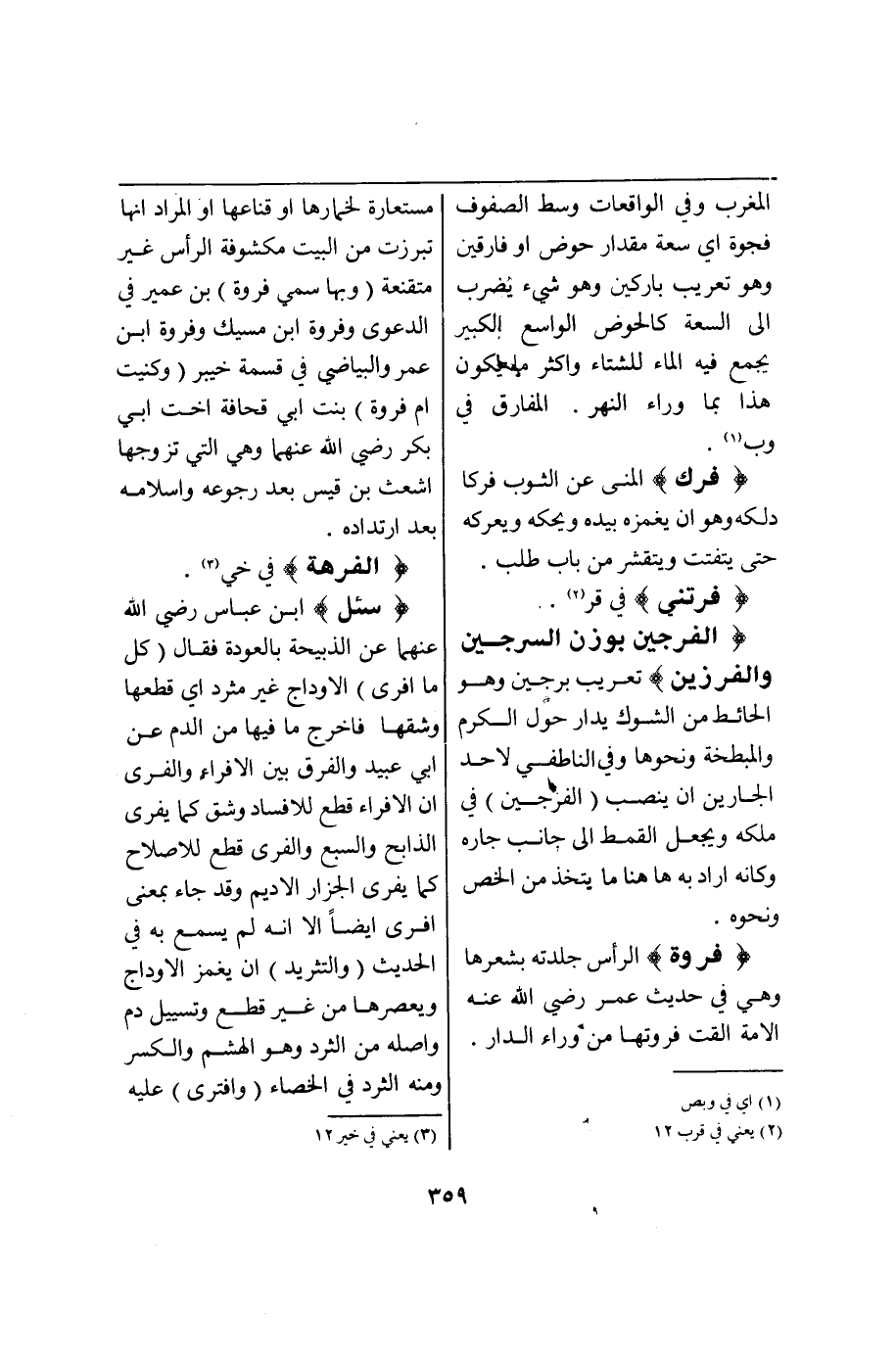 الْكَلَام أَفْرُقُ بِالضَّمِّ وَفَرَّقْتُ بَيْنَ الْأَجْسَام تَفْرِيقًا قَالَ وَقَوْلُ النَّبِيِّ - صَلَّى اللَّهُ عَلَيْهِ وَآلِهِ وَسَلَّمَ - «الْبَيِّعَانِ بِالْخِيَارِ مَا لَمْ يَتَفَرَّقَا بِالْأَبْدَانِ» لِأَنَّهُ يُقَالُ فَرَّقْتُ بَيْنَهُمَا فَتَفَرَّقَا قُلْت وَمِنْ هَذَا ذَكَرَ الْخَطَّابِيُّ أَنَّ (الِافْتِرَاقَ) بِالْكَلَامِ (وَالتَّفَرُّقَ) بِالْأَجْسَامِ لِأَنَّهُ يُقَالُ فَرَقْتُهُ فَافْتَرَقَ وَفَرَّقْتُهُ فَتَفَرَّقَ (وَفِي حَدِيثِ) عُمَرَ - رَضِيَ اللَّهُ عَنْهُ - فَرِّقُوا عَنْ الْمَنِيَّةِ وَاجْعَلُوا الرَّأْسَ رَأْسَيْنِ وَلَا تُلِثُّوا بِدَارٍ مُعْجِزَةٍ وَأَصْلِحُوا مَثَاوِيَكُمْ وَأَخِيفُوا الْهَوَامَّ قَبْلَ أَنْ تُخِيفَكُمْ وَاخْشَوْشِنُوا وَاخْشَوْشِبُوا وَتَمَعْدَدُوا أَيْ فَرِّقُوا أَمْوَالَكُمْ عَنْ الْمَنِيَّةِ بِأَنْ تَشْتَرُوا بِثَمَنِ الْوَاحِدِ مِنْ الْحَيَوَانِ اثْنَيْنِ حَتَّى إذَا مَاتَ أَحَدُهُمَا بَقِيَ الثَّانِي وَقَوْلُهُ (وَاجْعَلُوا الرَّأْسَ رَأْسَيْنِ) بَيَانٌ لِهَذَا الْمُجْمَلِ (وَالْإِلْثَاثُ) الْإِقَامَةُ (وَالْمُعْجِزَةُ) بِفَتْحِ الْجِيم وَكَسْرِهَا الْعَجْزُ يَعْنِي سِيحُوا فِي الْأَرْضِ وَلَا تُقِيمُوا بِدَارٍ تَعْجِزُونَ فِيهَا عَنْ الْكَسْبِ أَوْ عَنْ إقَامَةِ أَسْبَابِ الدِّينِ (وَالْمَثَاوِي) جَمْعُ مَثْوًى وَهُوَ الْمَنْزِلُ (وَالْهَوَامُّ) الْعَقَارِبُ وَالْحَيَّاتُ أَيْ اُقْتُلُوهَا قَبْل أَنْ تَقْتُلَكُمْ (وَالِاخْشِيشَانُ) (وَالِاخْشِيشَابُ) اسْتِعْمَالُ الْخُشُونَةِ فِي الْمَطْعَمِ وَالْمَشْرَبِ وَالْمَلْبَسِ (وَالتَّمَعْدُدُ) التَّشَبُّهُ بِمَعْدٍ وَهِيَ مِنْ قَبَائِلِ الْعَرَبِ يَقُولُ تَشَبَّهُوا بِهِمْ فِي خُشُونَةِ عَيْشِهِمْ وَاطِّرَاحِ زِيِّ الْعَجَمِ وَتَنَعُّمِهِمْ (وَإِفْرِيقِيَّةُ) بِتَخْفِيفِ الْيَاء وَتَشْدِيدِهَا مِنْ بِلَادِ الْمَغْرِبِ وَفِي الْوَاقِعَات وَسَط الصُّفُوف فَجْوَةٌ أَيْ سَعَةٌ مِقْدَارُ حَوْضٍ أَوْ فَارَقَيْنٍ وَهُوَ تَعْرِيبُ بَارَكَيْنِ وَهُوَ شَيْءٌ يَضْرِبُ إلَى السَّعَةِ كَالْحَوْضِ الْوَاسِعِ الْكَبِيرِ يُجْمَعُ فِيهِ الْمَاءُ لِلشِّتَاءِ وَأَكْثَرُ مَا يَكُونُ هَذَا بِمَا وَرَاء النَّهْر الْمَفَارِقُ فِي وب.