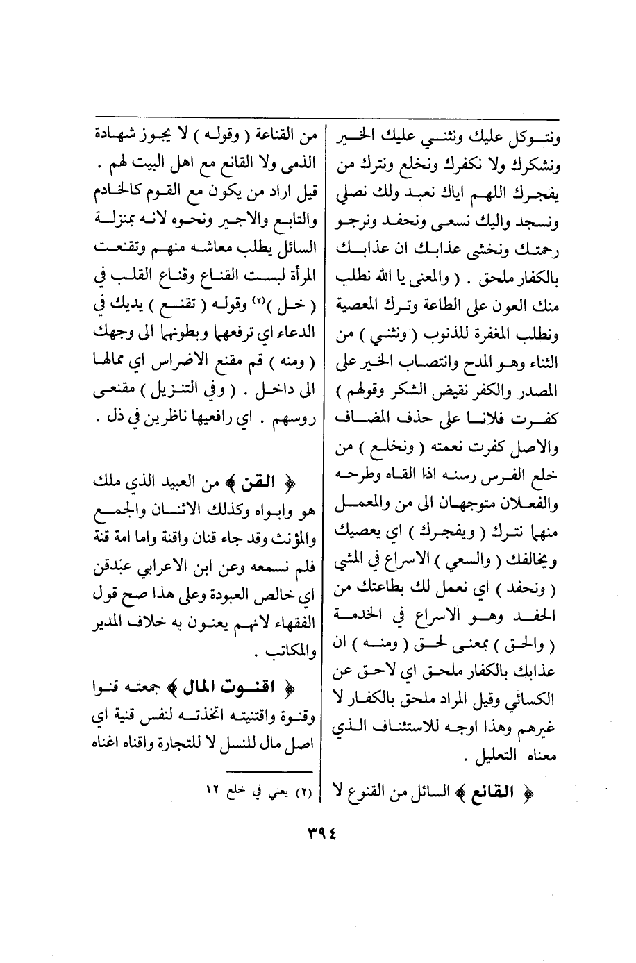 (ق ن ت) : (الْقُنُوتُ) الطَّاعَةُ وَالدُّعَاءُ وَالْقِيَامُ فِي قَوْلِهِ أَفْضَلُ الصَّلَاةِ طُولُ الْقُنُوتِ وَالْمَشْهُورُ الدُّعَاءُ وَقَوْلُهُمْ دُعَاءُ الْقُنُوتِ إضَافَةُ بَيَانٍ وَهُوَ اللَّهُمَّ إنَّا نَسْتَعِينُكَ وَنَسْتَغْفِرُكَ وَنُؤْمِنُ بِكَ وَنَتَوَكَّلُ عَلَيْك وَنُثْنِي عَلَيْكَ الْخَيْرَ وَنَشْكُرُكَ وَلَا نَكْفُرُكَ وَنَخْلَعُ وَنَتْرُكُ مِنْ يَفْجُرُكَ اللَّهُمَّ إيَّاكَ نَعْبُدُ وَلَكَ نُصَلِّي وَنَسْجُدُ وَإِلَيْك نَسْعَى وَنَحْفِدُ نَرْجُو رَحْمَتَكَ وَنَخْشَى عَذَابَكَ إنَّ عَذَابَكَ بِالْكُفَّارِ مُلْحَقٌ (وَالْمَعْنَى) يَا اللَّهُ نَطْلُبُ مِنْكَ الْعَوْنَ عَلَى الطَّاعَةِ وَتَرْكِ الْمَعْصِيَةِ وَنَطْلُبُ الْمَغْفِرَةَ لِلذُّنُوبِ (وَنُثْنِي) مِنْ الثَّنَاءِ وَهُوَ الْمَدْحُ وَانْتِصَابُ الْخَيْرِ عَلَى الْمَصْدَرِ وَالْكُفْرُ نَقِيضُ الشُّكْرِ (وَقَوْلُهُمْ) كَفَرْتُ فُلَانًا عَلَى حَذْفِ الْمُضَافِ وَالْأَصْلُ كَفَرْتُ نِعْمَتَهُ (وَنَخْلَعُ) مِنْ خَلَعَ الْفَرَسُ رَسَنَهُ إذَا أَلْقَاهُ وَطَرَحَهُ وَالْفِعْلَانِ مُتَوَجِّهَانِ إلَى مِنْ وَالْمُعْمَلُ مِنْهُمَا نَتْرُكُ (وَيَفْجُرُكَ)