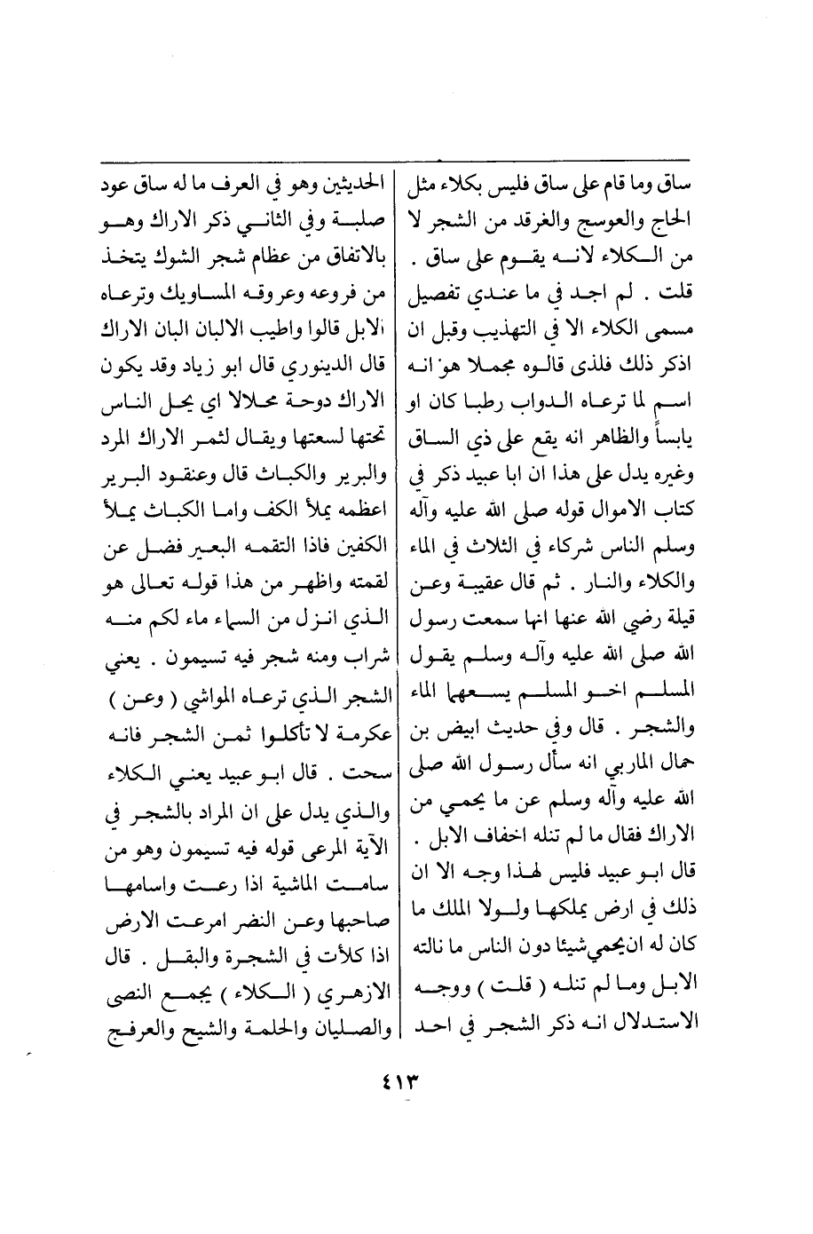 (ك ل أ) : (كَلَأَ الدَّيْنُ) تَأَخَّرَ كُلُوءًا فَهُوَ كَالِئٌ (وَمِنْهُ) «نَهَى عَنْ بَيْعِ الْكَالِئِ بِالْكَالِئِ» أَيْ النَّسِيئَةِ بِالنَّسِيئَةِ وَهُوَ أَنْ يَكُونَ عَلَى رَجُلٍ دَيْنٌ فَإِذَا حَلَّ أَجَلُهُ اسْتَبَاعَكَ مَا عَلَيْهِ إلَى أَجَلٍ (وَالْكَلَأُ) وَاحِدُ الْأَكْلَاءِ وَهُوَ كُلُّ مَا رَعَتْهُ الدَّوَابُّ مِنْ الرَّطْبِ وَالْيَابِسِ وَذَكَرَ الْحَلْوَائِيُّ عَنْ مُحَمَّدٍ - رَحِمَهُ اللَّهُ - أَنَّ (الْكَلَأَ) مَا لَيْسَ لَهُ سَاقٌ وَمَا قَامَ عَلَى سَاقٍ فَلَيْسَ بِكَلَاءٍ مِثْلُ الْحَاجِ وَالْعَوْسَجُ وَالْغَرْقَدُ مِنْ الشَّجَرِ لَا مِنْ الْكَلَأِ لِأَنَّهُ يَقُومُ عَلَى سَاقٍ قُلْتُ لَمْ أَجِدْ فِي مَا عِنْدِي تَفْصِيلُ مُسَمَّى الْكَلَاءِ إلَّا فِي التَّهْذِيبِ وَقَبْلَ أَنْ أَذْكُرَ ذَلِكَ فَاَلَّذِي قَالُوهُ مُجْمَلًا هُوَ أَنَّهُ اسْمٌ لِمَا تَرْعَاهُ الدَّوَابُّ رَطْبًا كَانَ أَوْ يَابِسًا وَالظَّاهِرُ أَنَّهُ يَقَعُ عَلَى ذِي السَّاقِ وَغَيْرِهِ يَدُلُّ عَلَى هَذَا أَنَّ أَبَا عُبَيْدٍ ذَكَرَ فِي كِتَابِ الْأَمْوَالِ قَوْلَهُ - صَلَّى اللَّهُ عَلَيْهِ وَآلِهِ وَسَلَّمَ - «النَّاسُ شُرَكَاءُ فِي الثَّلَاثِ فِي الْمَاءِ وَالْكَلَإِ وَالنَّارِ» ثُمَّ قَالَ عَقِيبَهُ وَعَنْ قَيْلَةَ - رَضِيَ اللَّهُ عَنْهَا - أَنَّهَا سَمِعَتْ رَسُولَ اللَّهِ - صَلَّى اللَّهُ عَلَيْهِ وَآلِهِ وَسَلَّمَ - يَقُولُ «الْمُسْلِمُ أَخُو الْمُسْلِمِ يَسَعُهُمَا الْمَاءُ وَالشَّجَرُ» قَالَ وَفِي حَدِيثِ أَبْيَضَ بْنِ حَمَّالٍ الْمَأْرِبِيِّ