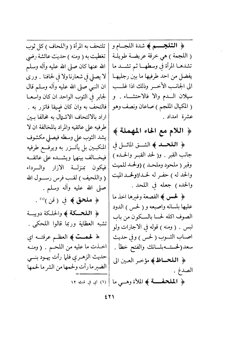 (ل ج م) : (التَّلَجُّمُ) شِدَّةُ اللِّجَامِ (وَاللُّجْمَةُ) هِيَ خِرْقَةٌ عَرِيضَةٌ طَوِيلَةٌ تَشُدُّهَا الْمَرْأَةُ فِي وَسَطِهَا ثُمَّ تَشُدُّ مَا يَفْضُلُ مِنْ أَحَدِ طَرَفَيْهَا مَا بَيْنَ رِجْلَيْهَا إلَى الْجَانِبِ الْآخَرِ وَذَلِكَ إذَا غَلَبَ سَيَلَانُ الدَّمِ وَإِلَّا فَالِاحْتِشَاءُ وَ (الْمِكْيَالُ الْمُلْجَمُ) صَاعَانِ وَنِصْفٌ