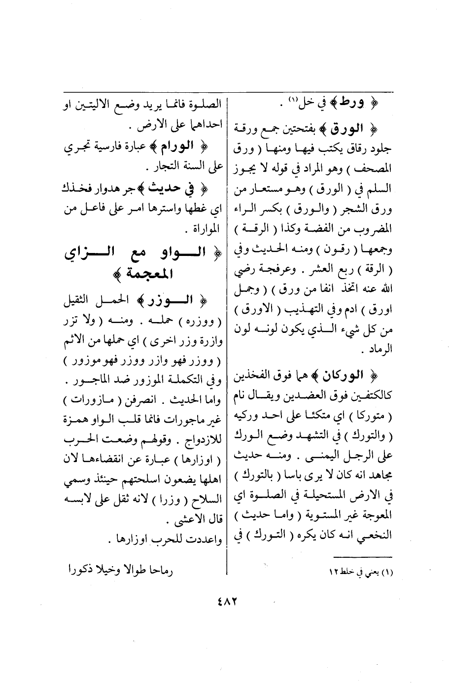 (ور د) : (وَرَدَ) الْمَاءَ أَوْ الْبَلَدَ أَشْرَفَ عَلَيْهِ أَوْ وَصَلَ إلَيْهِ دَخَلَهُ أَوْ لَمْ يَدْخُلْهُ وُرُودًا (وَاسْتَوْرَدَ) مِثْلُهُ وَبِاسْمِ الْفَاعِلِ مِنْهُ سُمِّيَ (الْمُسْتَوْرِدُ) بْنُ الْأَحْنَفِ الْعِجْلِيُّ وَهُوَ الَّذِي قَتَلَهُ عَلِيٌّ - رَضِيَ اللَّهُ تَعَالَى عَنْهُ - بِالرِّدَّةِ وَقَسَّمَ مَالَهُ بَيْنَ وَرَثَتِهِ (وَالْوِرْدُ) الْمَوْرِدُ وَمِنْهُ (الْوَرْدُ) مِنْ الْقُرْآنِ الْوَظِيفَةُ وَهُوَ مِقْدَارٌ مَعْلُومٌ إمَّا سُبُعٌ أَوْ نِصْفُ سُبُعٍ أَوْ مَا أَشْبَهَ ذَلِكَ يُقَالُ قَرَأَ فُلَانٌ (وِرْدَهُ وَحِزْبَهُ) بِمَعْنًى وَرُوِيَ أَنَّ الْحَسَنَ وَابْنَ سِيرِينَ أَنَّهُمَا كَانَا يَكْرَهَانِ (الْأَوْرَادَ) قَالَ أَبُو عُبَيْدٍ كَانُوا أَحْدَثُوا أَنْ جَعَلُوا السُّورَةَ الطَّوِيلَةَ مَعَ أُخْرَى دُونَهَا فِي الطُّولِ ثُمَّ يَزِيدُونَ دُونَهَا كَذَلِكَ حَتَّى يَتِمَّ الْجُزْءُ وَلَا يَكُونُ فِيهِ سُورَةٌ مُنْقَطِعَةٌ وَلَكِنْ تَكُونُ كُلُّهَا سُوَرًا تَامَّةً (وَالْوَرْدُ) هَذَا النَّوْرُ الَّذِي يُشَمُّ قَالُوا أُسْمِيَ ذَلِكَ لِحُمْرَتِهِ (وَالْوَرْدَةُ) فِي أَلْوَانِ الدَّوَابِّ لَوْنٌ يَضْرِبُ إلَى الصُّفْرَةِ الْحَسَنَةِ (وَفَرَسٌ وَرْدٌ وَالْأُنْثَى وَرْدَةٌ) وَقَدْ وَرُدَ وُرُودَةً (وَفَرَسٌ وَرْدٌ) أَغْبَسُ سَمْنَد (وَوَرْدَانُ) غُلَامُ عَمْرِو بْنِ الْعَاصِ (وَبَنَاتُ وَرْدَانَ) دُودُ الْعَذِرَةِ.
