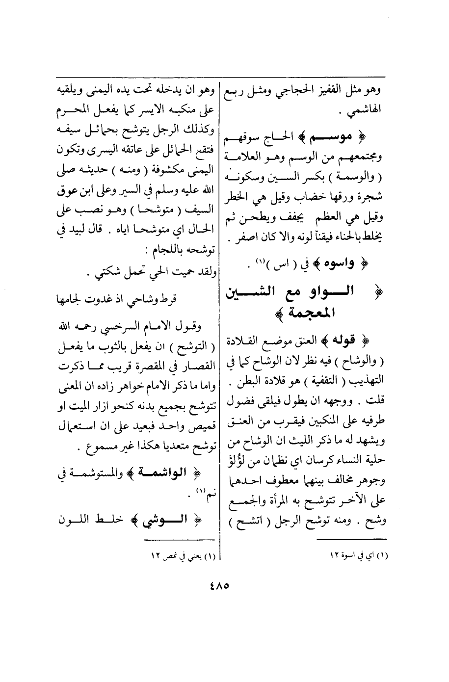 (وس ع) : (قَوْلُهُ) نِيَّةُ الْعَدُوِّ (لَا تَسَعُ) فِي هَذَا الصَّوَابُ طَرْحُ فِي وَكَذَا قَوْلُهُمْ إذَا اجْتَمَعُوا فِي أَكْبَرِ مَسَاجِدِهِمْ لَمْ يَسَعُوا فِيهِ صَوَابُهُ لَمْ يَسَعُوهُ أَوْ لَمْ يَسَعْهُمْ لِأَنَّهُ يُقَالُ (وَسِعَ الشَّيْءُ) الْمَكَانَ وَلَا يُقَالُ فِي الْمَكَانِ وَفِي مَعْنَاهُ (وَسِعَهُ) الْمَكَانُ وَذَلِكَ إذَا لَمْ يَضِقْ عَنْهُ وَمِنْهُ قَوْلُهُمْ لَا يَسَعُكَ أَنْ تَفْعَلَ كَذَا أَيْ لَا يَجُوزُ لِأَنَّ الْجَائِزَ مُوسَعٌ غَيْرُ مُضَيَّقٍ وَمِنْهُ (لَا يَسَعُ) امْرَأَتَيْهِ أَنْ تُقِيمَا مَعَهُ أَيْ لَا يَجُوزُ لَهُمَا الْإِقَامَةُ وَمِثْلُهُ (لَا يَسَعُ) الْمُسْلِمِينَ أَنْ يَأْبَوْا عَلَى أَهْلِ الْحِصْنِ.