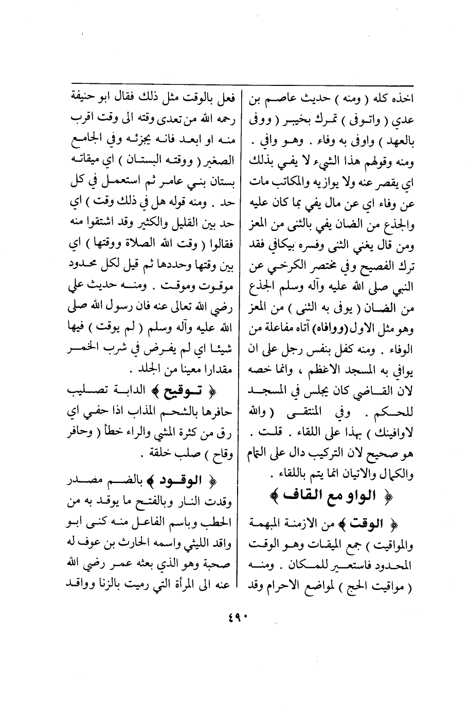 (وف ي) : (وَفَى) الشَّيْءُ تَمَّ وُفِيًّا (وَكِيلٌ وَافٍ وَأَوْفَاهُ) أَتَمَّهُ إيفَاءً وَمِنْهُ قَوْلُهُ (أَوْفَى الْعَمَلَ وَوَفَّاهُ حَقَّهُ وَأَوْفَاهُ إيَّاهُ) أَعْطَاهُ وَافِيًا تَامًّا (وَاسْتَوْفَاهُ وَتَوَفَّاهُ) أَخَذَهُ كُلَّهُ (وَمِنْهُ) حَدِيثُ عَاصِمِ بْنِ عَدِيٍّ (وَأَتَوَفَّى) تَمْرَكَ بِخَيْبَرَ (وَوَفَى بِالْعَهْدِ) وَأَوْفَى بِهِ وَفَاءً وَهُوَ وَفِيٌّ وَمِنْهُ وَقَوْلُهُمْ هَذَا الشَّيْءُ لَا يَفِي بِذَلِكَ أَيْ يَقْصُرُ عَنْهُ وَلَا يُوَازِيهِ وَالْمُكَاتَبُ مَاتَ عَنْ وَفَاءٍ أَيْ عَنْ مَالٍ يَفِي بِمَا كَانَ عَلَيْهِ وَالْجَذَعُ مِنْ الضَّأْنِ يَفِي