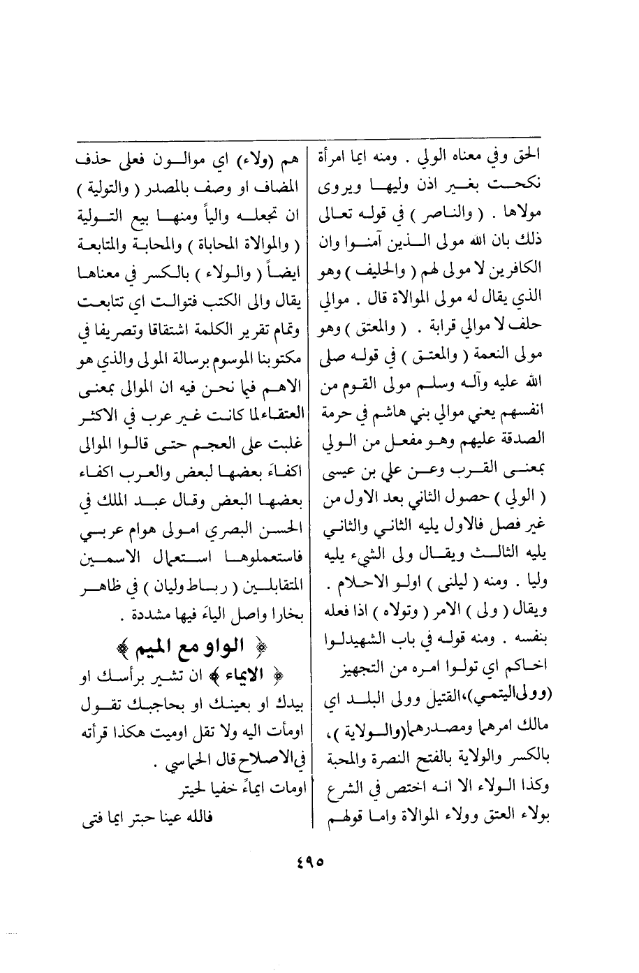 (ول ي) : (الْمَوْلَى) عَلَى وُجُوهٍ ابْنُ الْعَمِّ وَالْعَصَبَةُ كُلُّهَا وَمِنْهُ {وَإِنِّي خِفْتُ الْمَوَالِيَ مِنْ وَرَائِي} [مريم: 5] (وَالرَّبُّ وَالْمَالِكُ) فِي قَوْله تَعَالَى {ثُمَّ رُدُّوا إِلَى اللَّهِ مَوْلاهُمُ الْحَقِّ} [الأنعام: 62] وَفِي مَعْنَاهُ الْوَلِيُّ وَمِنْهُ «أَيُّمَا امْرَأَةٍ نَكَحَتْ بِغَيْرِ إذْنِ وَلِيِّهَا» وَيُرْوَى مَوْلَاهَا (وَالنَّاصِرُ) فِي قَوْله تَعَالَى {ذَلِكَ بِأَنَّ اللَّهَ مَوْلَى الَّذِينَ آمَنُوا وَأَنَّ الْكَافِرِينَ لا مَوْلَى لَهُمْ} [محمد: 11] (وَالْحَلِيفُ) وَهُوَ الَّذِي يُقَالُ لَهُ مَوْلَى الْمُوَالَاةِ قَالَ