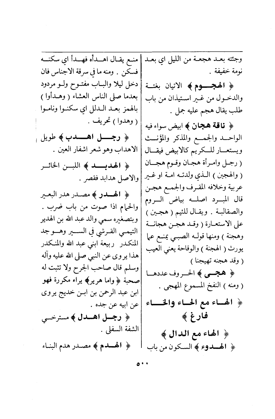 (هـ ج ر) : (الْهَجْرُ) خِلَافُ الْوَصْلِ يُقَالُ هَجَرَ أَخَاهُ إذَا صَرَمَهُ وَقَطَعَ كَلَامُهُ هَجْرًا وَهِجْرَانًا فَهُوَ هَاجِرٌ وَالْأَخُ مَهْجُورٌ وَفِي بَابِ الْحَظْرِ وَالْإِبَاحَةِ فِي شَرْحِ الْقُدُورِيِّ أَنَّ خَادِمَ مَيْمُونَةَ - رَضِيَ اللَّهُ عَنْهَا - رَأَتْ فِرَاشَ امْرَأَةِ ابْنِ عَبَّاسٍ - رَضِيَ اللَّهُ عَنْهُمَا - نَاحِيَةً أَيْ بَعِيدَةً مِنْ فِرَاشِهِ فَقَالَتْ (هَجْرَى) أَنْتِ فَقَالَتْ لَا وَلَكِنِّي إذَا حِضْتُ لَمْ يَقْرَبْ فِرَاشِي كَأَنَّهَا جَعَلَتْهُ صِفَةً لَهَا كَعَقْرَى وَحَلْقَى فِي أَحَدِ الْأَوْجُهِ وَإِنْ لَمْ أَجِدْهُ (وَالْهَجَرُ) بِالْفَتْحِ أَيْضًا الْهَذَيَانُ وَمِنْهُ قَوْله تَعَالَى {سَامِرًا تَهْجُرُونَ} [المؤمنون: 67] (وَالْهُجْرُ) بِالضَّمِّ الْفُحْشُ اسْمٌ مَنْ أَهْجَرَ فِي مَنْطِقِهِ إذَا أَفْحَشَ (وَالْهِجْرَةُ) تَرْكُ الْوَطَنِ وَمُفَارَقَتُهُ إلَى مَوْضِعٍ آخَرَ اسْمٌ مَنْ هَاجَرَ مِنْ بَلَدٍ إلَى بَلَدٍ مُهَاجَرَةً (وَقَوْلُ الْحَسَنِ) هِجْرَةُ الْأَعْرَابِيِّ إذَا ضَمَّهُمْ دِيوَانُهُمْ يَعْنِي إذَا أَسْلَمَ وَهَاجَرَ إلَى بِلَادِ الْمُسْلِمِينَ فَهِجْرَتُهُ إنَّمَا تَصِحُّ إذَا ثَبَتَ اسْمُهُ فِي دِيوَانِ الْغُزَاةِ أَيْ فِي جَرِيدَتِهِمْ (وَيُقَالُ هَجَّرَ) إذَا سَارَ فِي الْهَاجِرَةِ وَهِيَ نِصْفُ النَّهَارِ فِي الْقَيْظِ خَاصَّةً ثُمَّ قِيلَ (هَجَّرَ إلَى الصَّلَاةِ) إذَا بَكَّرَ وَمَضَى إلَيْهَا فِي أَوَّلِ وَقْتِهَا (وَفِي الْحَدِيثِ) «لَوْ يَعْلَمُ النَّاسُ مَا فِي التَّهْجِيرِ لَاسْتَبَقُوا إلَيْهِ» وَفِي الْحَدِيثِ «الْمُهَجِّرُ إلَى الْجُمُعَةِ كَالْمُهْدِي بَدَنَةً» قَالَ