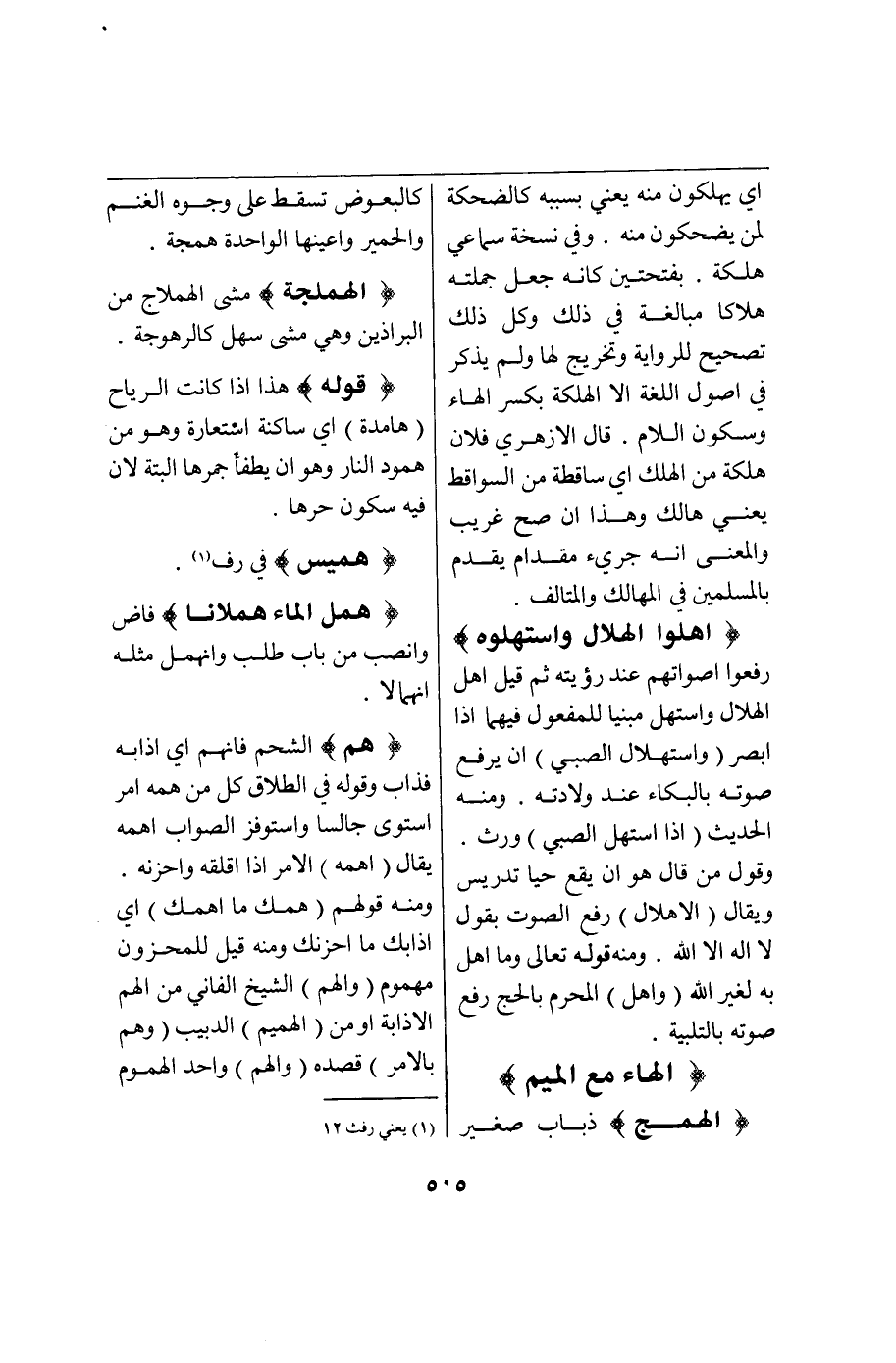 (هـ ل ك) : (الْهَلَاكُ) السُّقُوطُ وَقِيلَ الْفَسَادُ وَقِيلَ هُوَ مَصِيرُ الشَّيْءِ إلَى حَيْثُ لَا يُدْرَى أَيْنَ هُوَ (وَالْهَلَكَةُ) مِثْلُهُ وَقَوْلُهُ - صَلَّى اللَّهُ عَلَيْهِ وَآلِهِ وَسَلَّمَ - «لَا يُغَادِرُ رُسُلِي فَهَلَكَ عَلَى أَيْدِيهِمْ» أَيْ اسْتَهْلَكُوهُ يُقَالُ هَلَكَ الشَّيْءُ فِي يَدِهِ إذَا كَانَ بِغَيْرِ صُنْعِهِ (وَهَلَكَ عَلَى يَدِهِ) إذَا اسْتَهْلَكَهُ قُلْتُ كَأَنَّهُ قَاسَهُ عَلَى قَوْلِهِمْ قُتِلَ فُلَانٌ عَلَى يَدِ فُلَانٍ وَمَاتَ فِي يَدِهِ وَلَا يُقَالُ مَاتَ عَلَى يَدِهِ وَيُقَالُ لِمَنْ ارْتَكَبَ أَمْرًا عَظِيمًا (هَلَكْتَ وَأَهْلَكْتَ) (وَفِي) حَدِيثِ عُمَرَ - رَضِيَ اللَّهُ تَعَالَى عَنْهُ - «لَا تَسْتَعْمِلُوا الْبَرَاءَ عَلَى جَيْشِ الْمُسْلِمِينَ فَإِنَّهُ هُلَكَةٌ» مَنْ