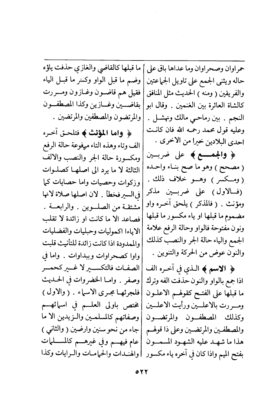 (مِمَّا يَخْتَصُّ) بِالْأَسْمَاءِ: التَّثْنِيَةُ: ثُنِّيَ الِاسْمُ أُلْحِقَ بِآخِرِهِ أَلِفٌ أَوْ يَاءٌ مَفْتُوحٌ مَا قَبْلَهَا، وَنُونٌ مَكْسُورَةٌ الْأَلِفُ حَالَةَ الرَّفْعِ عَلَامَةُ التَّثْنِيَةِ، وَالْيَاءُ حَالَةَ النَّصْبِ وَالْجَرِّ كَذَلِكَ، وَالنُّونُ عِوَضٌ عَنْ الْحَرَكَةِ وَالتَّنْوِينِ، وَلَا تَسْقُطُ تَاءُ التَّأْنِيثِ إلَّا فِي كَلِمَتَيْنِ: خُصْيَانِ، وَأَلْيَانِ، وَقَدْ جَاءَنَا عَلَى الْأَصْلِ، وَهُوَ الْقِيَاسُ لِأَنَّ حَقَّ الْمُثَنَّى أَنْ تَكُونَ صِيغَةُ الْمُفْرَدِ فِيهِ مَحْفُوظَةً إلَّا مَا فِي آخِرِهِ أَلِفٌ، وَذَلِكَ لِأَنَّهَا إنْ كَانَتْ ثَالِثَةً رُدَّتْ إلَى