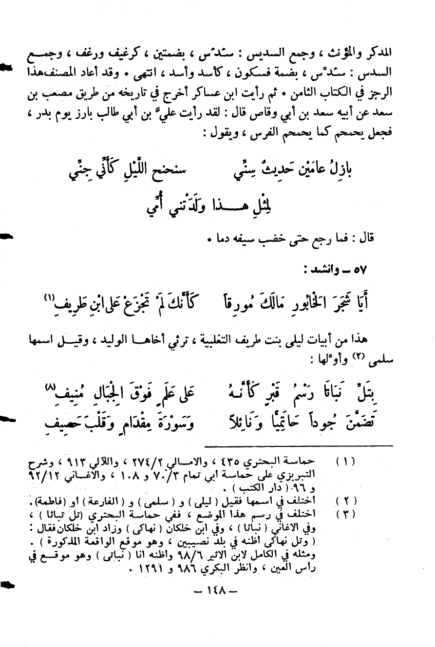 (¬1) حماسة البحتري 435. والامالي 2/ 274، واللآلي 913، وشرح التبريزي على حماسة أبي تمام 3/ 70 و 108، والأغاني 12/ 92 و 96 (دار الكتب).