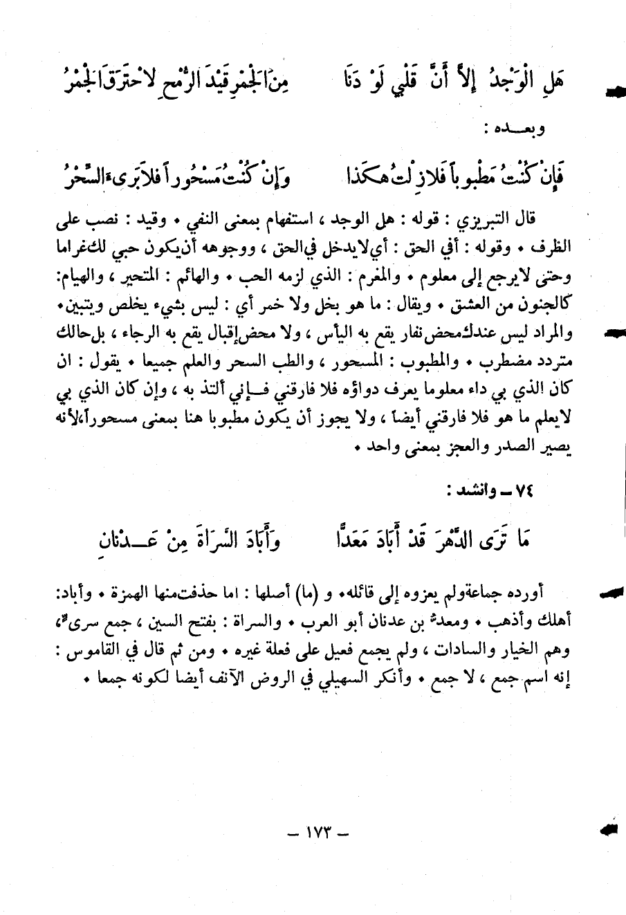 كالجنون من العشق. ويقال: ما هو بخل ولا خمر أي: ليس بشيء يخلص ويتبين، والمراد ليس عندك محض نفار يقع به اليأس، ولا محض إقبال يقع به الرجاء، بل حالك متردد مضطرب. والمطبوب: المسحور، والطب السحر والعلم جميعا. يقول: ان كان الذي بي داء معلوما يعرف دواؤه فلا فارقني فإني ألتذ به، وإن كان الذي بي لا يعلم ما هو فلا فارقني أيضا، ولا يجوز أن يكون مطبوبا هنا بمعنى مسحورا، لأنه يصير الصدر والعجز بمعنى واحد.