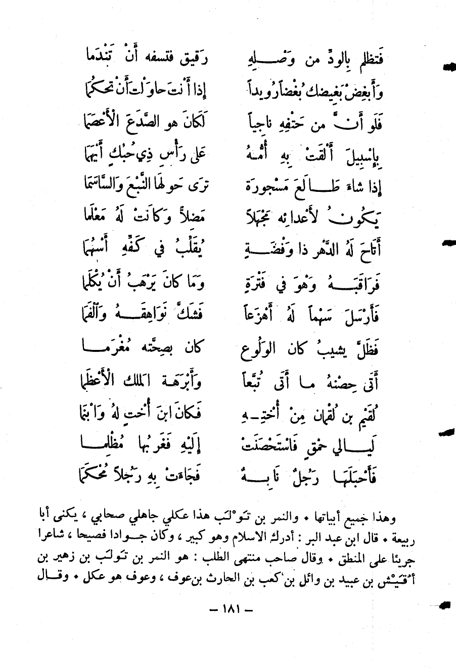 وهذا جميع أبياتها. والنمر بن تولب هذا عكلي جاهلي صحابي، يكنى أبا ربيعة. قال ابن عبد البر: أدرك الاسلام وهو كبير، وكان جوادا فصيحا، شاعرا جريئا على المنطق. وقال صاحب منتهى الطلب: هو النمر بن تولب بن زهير بن أقيش بن عبيد بن وائل بن كعب بن الحارث بن عوف، وعوف هو عكل. وقال