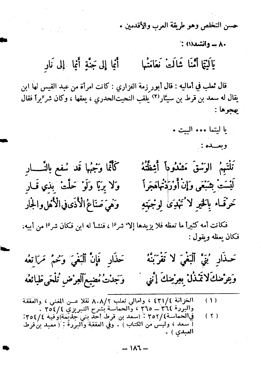 (¬1) الخزانة 4/ 431، وأمالي ثعلب 2/ 808 نقلا عن المغني، والعققة والبررة 364 - 365، والحماسة بشرح التبريزي 4/ 354.