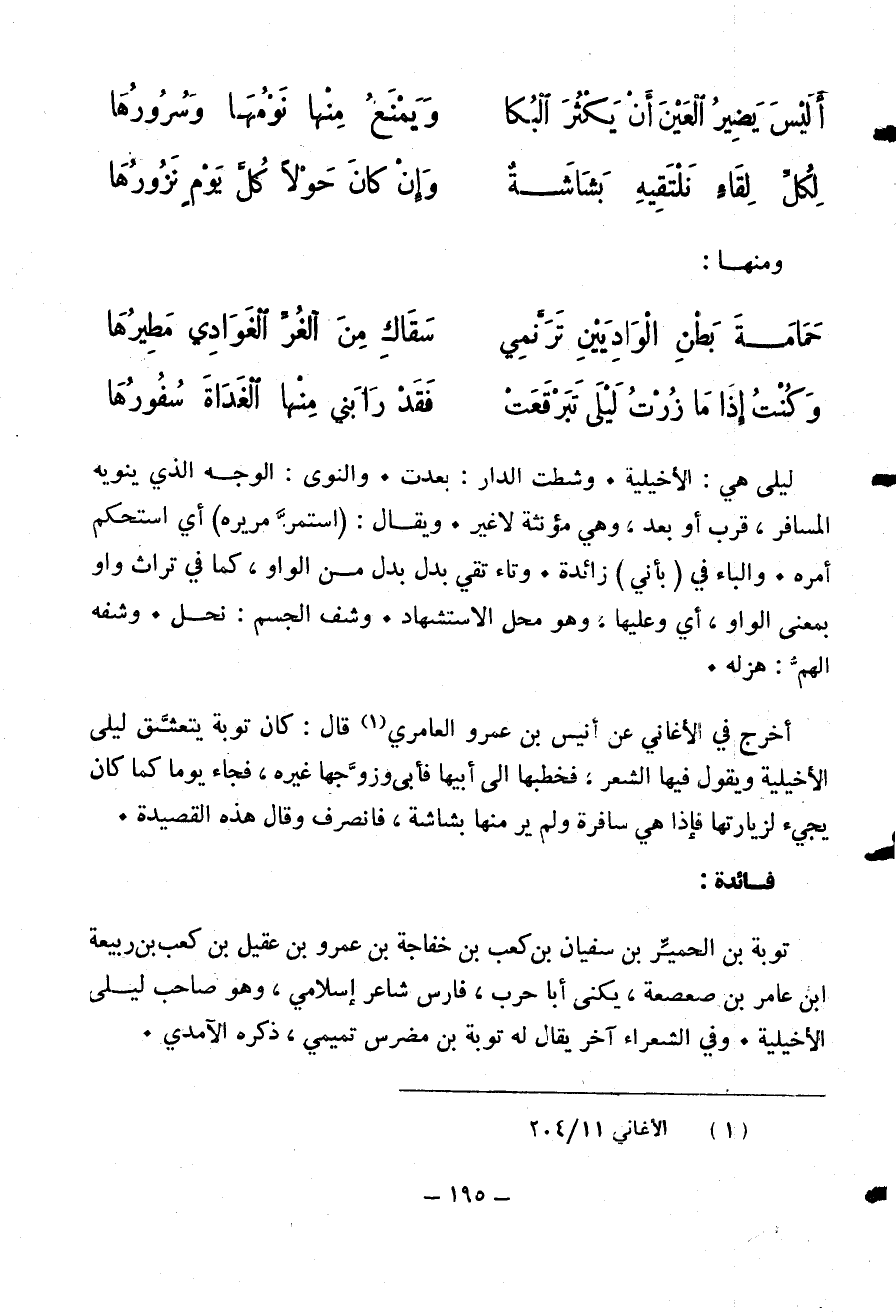أخرج في الأغاني عن أنيس بن عمرو العامري (¬1) قال: كان توبة يتعشّق ليلى الأخيلية ويقول فيها الشعر، فخطبها الى أبيها فأبى وزوّجها غيره، فجاء يوما كما كان يجيء لزيارتها فإذا هي سافرة ولم ير منها بشاشة، فانصرف وقال هذه القصيدة.