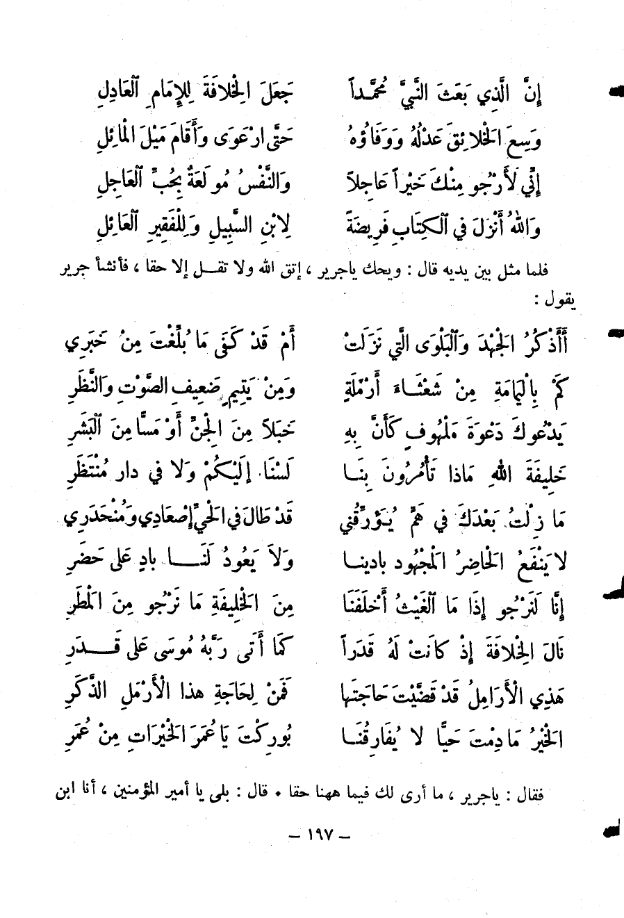 فقال: يا جرير، ما أرى لك فيما ههنا حقا. قال: بلى يا أمير المؤمنين، أنا ابن