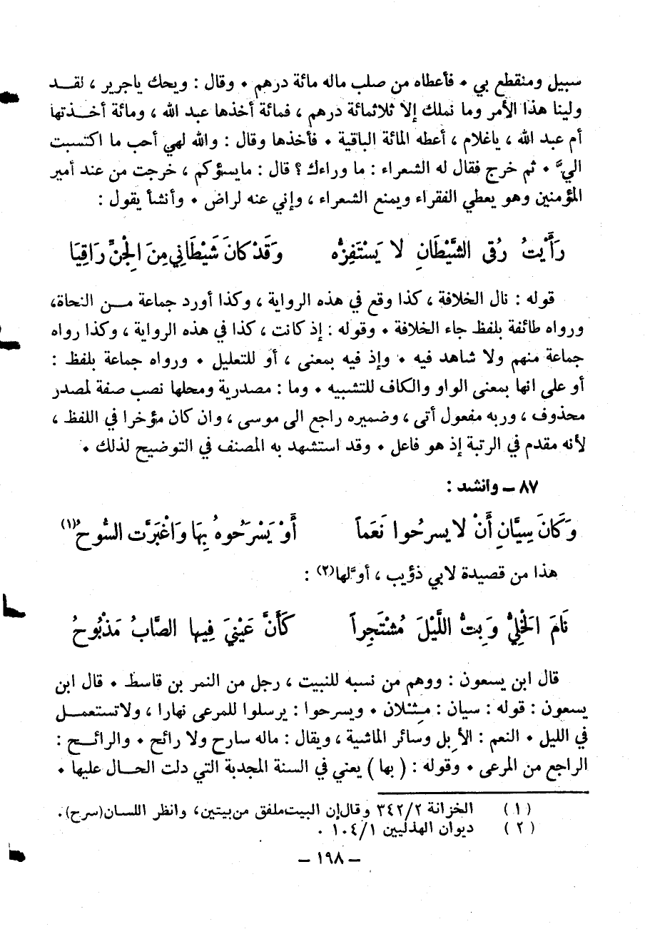 قال ابن يسعون: ووهم من نسبه للنبيت، رجل من النمر بن قاسط. قال ابن يسعون: قوله: سيان: مثلان. ويسرحوا: يرسلوا للمرعى نهارا، ولا تستعمل في الليل. النعم: الأبل وسائر الماشية، ويقال: ماله سارح ولا رائح. والرائح: