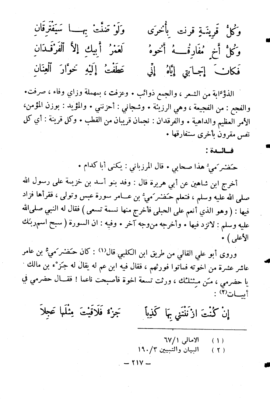 والفجع: من الفجيعة، وهي الرزيئة. وشجاني: أحزنني. والمؤيد: بوزن المؤمن، الأمر العظيم والداهية. والفرقدان: نجمان قريبان من القطب. وكل قرينة: أي كل نفس مقرون بأخرى ستفارقها.
