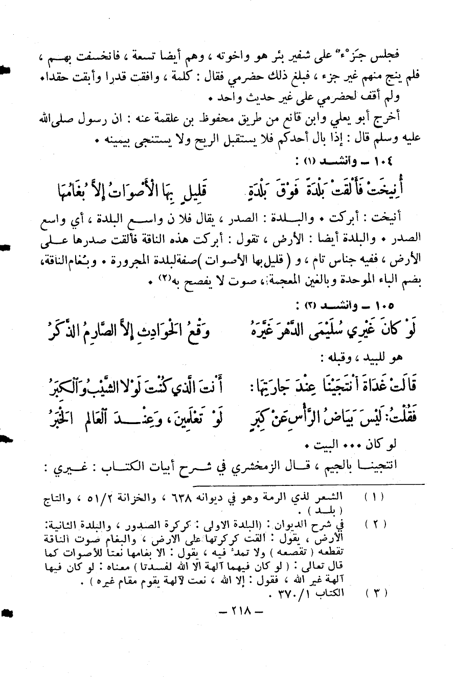 أنيخت: أبركت. والبلدة: الصدر، يقال فلان واسع البلدة، أي واسع الصدر. والبلدة أيضا: الأرض، تقول: أبركت هذه الناقة فألقت صدرها على الأرض، ففيه جناس تام، و (قليل بها الأصوات) صفة لبلدة المجرورة. وبغام الناقة، بضم الباء الموحدة وبالغين المعجمة، صوت لا يفصح به (¬2).