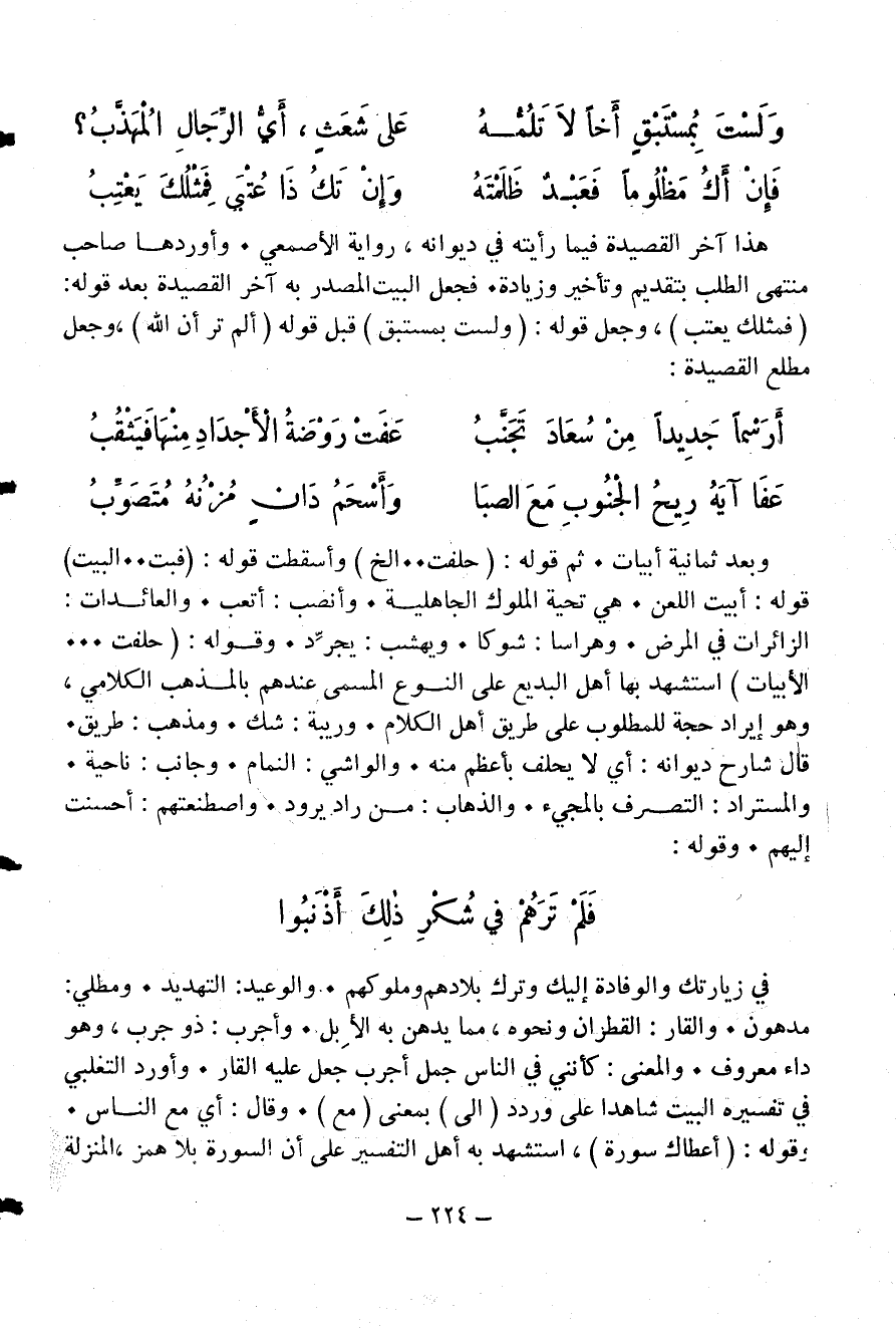 هذا آخر القصيدة فيما رأيته في ديوانه، رواية الأصمعي. وأوردها صاحب منتهى الطلب بتقديم وتأخير وزيادة. فجعل البيت المصدر به آخر القصيدة بعد قوله: