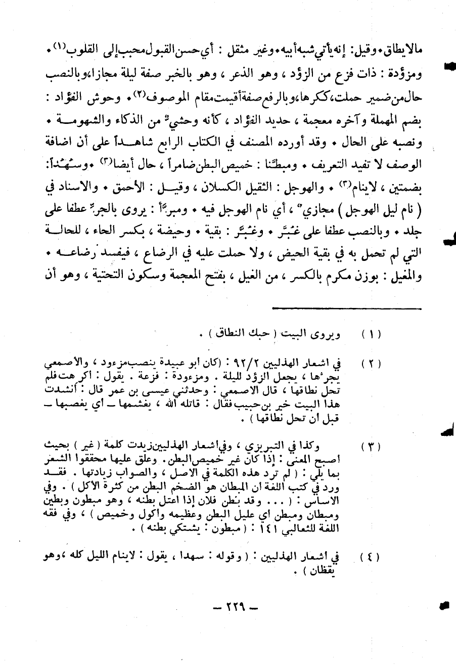 (¬3) وكذا في التبريزي، وفي أشعار الهذليين زيدت كلمة (غير) بحيث أصبح المعنى: إذا كان غير خميص البطن. وعلق عليها محققوا الشعر بما يلي: (لم ترد هذه الكلمة في الاصل، والصواب زيادتها. فقد ورد في كتب اللغة ان المبطان هو الضخم البطن من كثرة الأكل). وفي الاساس: (... وقد بطن فلان إذا اعتل بطنه، وهو مبطون وبطين ومبطان ومبطن أي عليل البطن وعظيمه وأكول وخميص)، وفي فقه اللغة