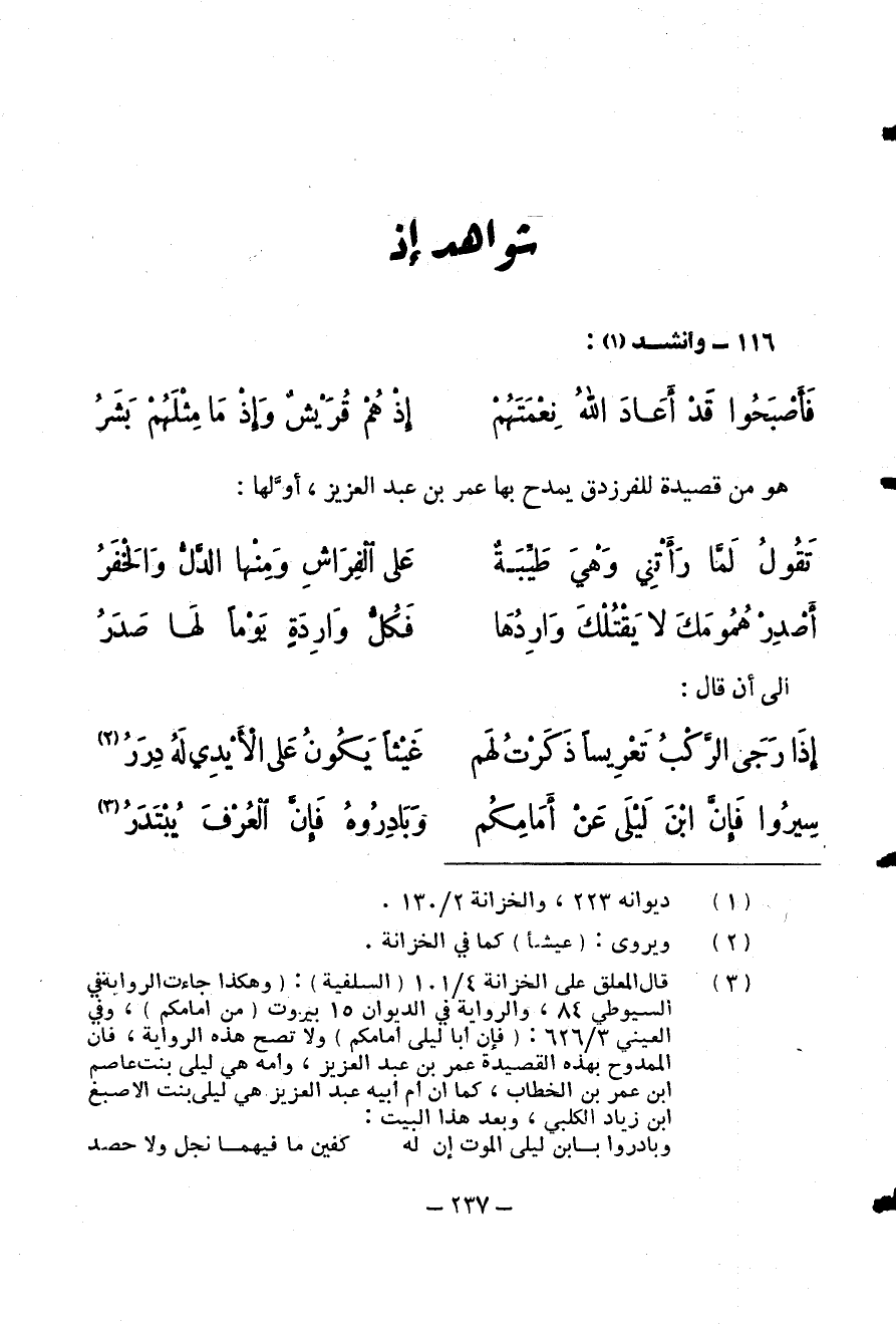 (¬3) قال المعلق على الخزانة 4/ 101 (السلفية): (وهكذا جاءت الرواية في السيوطي 84، والرواية في الديوان 15 بيروت (من امامكم)، وفي العيني 3/ 626: (فإن أبا ليلى أمامكم) ولا تصح هذه الرواية، فان الممدوح بهذه القصيدة عمر بن عبد العزيز، وأمه هي ليلى بنت عاصم ابن عمر بن الخطاب، كما ان أم أبيه عبد العزيز هي ليلى بنت الاصبغ ابن زياد الكلبي، وبعد هذا البيت:
