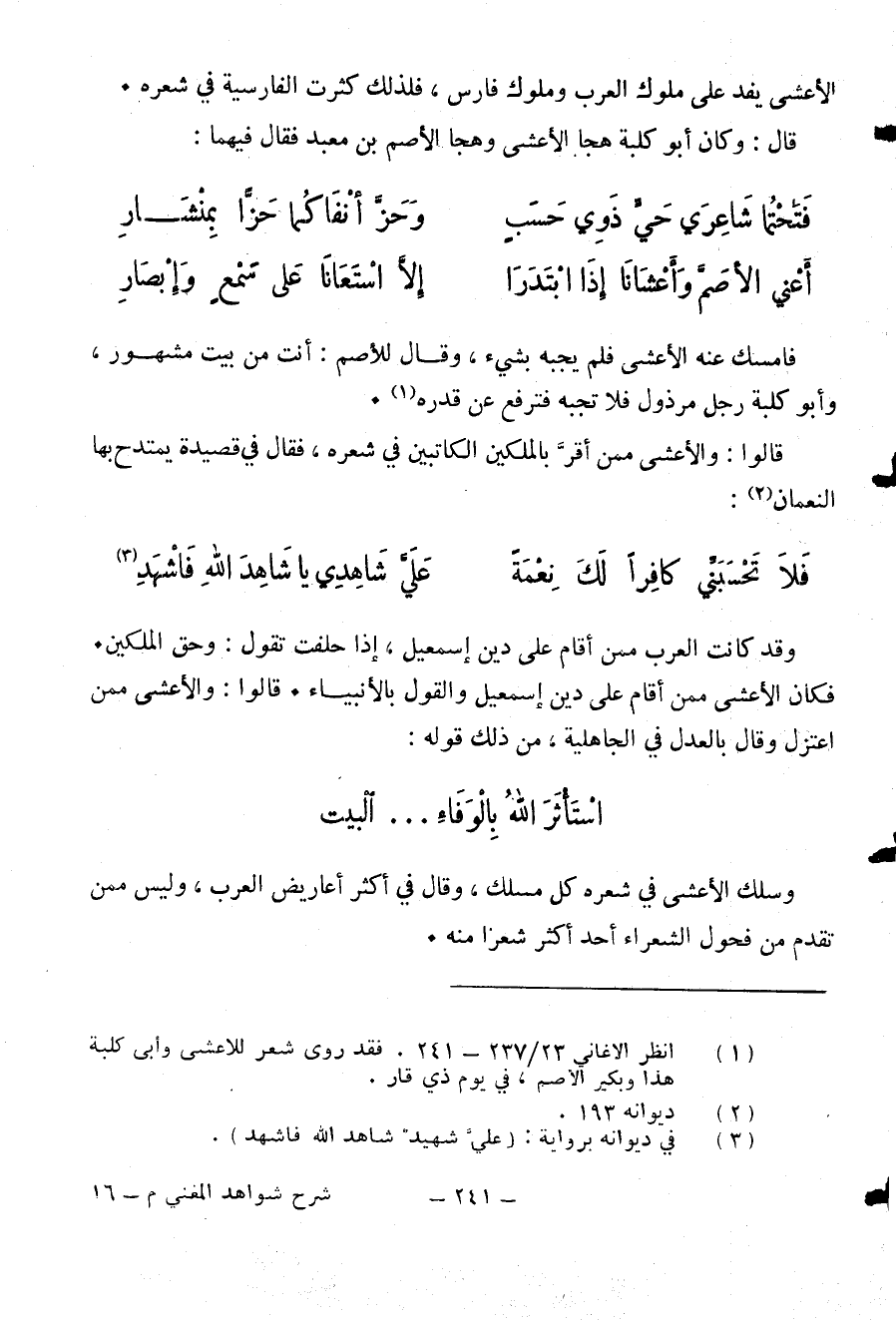 فكان الأعشى ممن أقام على دين إسمعيل والقول بالأنبياء. قالوا: والأعشى ممن اعتزل وقال بالعدل في الجاهلية، من ذلك قوله: