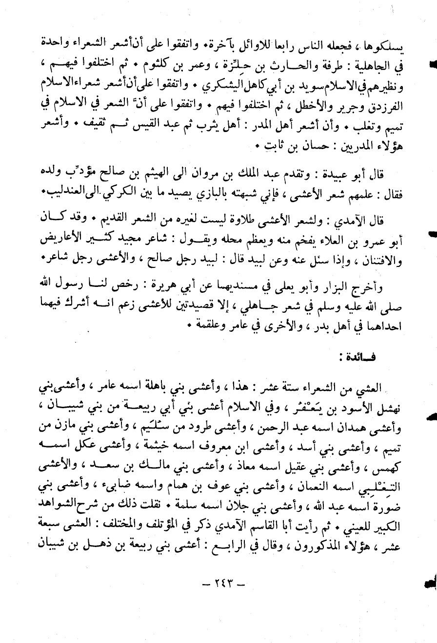 العشي من الشعراء ستة عشر: هذا، وأعشى بني باهلة اسمه عامر، وأعشى بني نهشل الأسود بن يعفر، وفي الاسلام أعشى بني أبي ربيعة من بني شيبان، وأعشى همدان اسمه عبد الرحمن، وأعشى طرود من سليم، وأعشى بني مازن من تميم، وأعشى بني أسد، وأعشى ابن معروف اسمه خيثمة، وأعشى عكل اسمه كهمس، وأعشى بني عقيل اسمه معاذ، وأعشى بني مالك بن سعد، والأعشى التغلبي اسمه النعمان، وأعشى بني عوف بن همام واسمه ضابئ، وأعشى بني ضورة اسمه عبد الله، وأعشى بني جلان اسمه سلمة. نقلت ذلك من شرح الشواهد الكبير للعيني. ثم رأيت أبا القاسم الآمدي ذكر في المؤتلف والمختلف: العشى سبعة عشر، هؤلاء المذكورون، وقال في الرابع: أعشى بني ربيعة بن ذهل بن شيبان