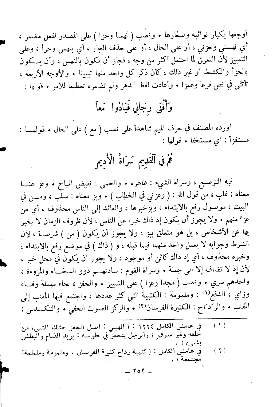 فيه الترصيع، وسراة الشيء: ظاهره. والحمى: نقيض المباح. وعز هنا معناه: غلب، من قول الله: (وعزني في الخطاب). وبز معناه: سلب، ومن في البيت، موصول رفع بالابتداء، وبزخبرها، والعائد إلى الناس محذوف، أي من عزّ منهم. ولا يجوز أن يكون إذ ذاك خبرا عن الناس، لأن ظروف الزمان لا يخبر بها عن الأشخاص، بل هو متعلق ببز، ولا يجوز أن يكون (من) شرطا، لأن الشرط وجوابه لا يعمل واحد منهما فيما قبله، و (ذاك) في موضع رفع بالابتداء، وخبره محذوف، أي إذ ذاك كائن أو موجود، ولا يجوز ان يكون في محل خبر، لأن إذ لا تضاف إلا الى جملة. وسراة القوم: سادتهم ذوو السخاء والمروءة، واحدهم سري. ونصب (مجدا وعزا) على التمييز. والحفز، بحاء مهملة وفاء وزاي، الدفع (¬1): وملمومة: الكتيبة التي كثر عددها، واجتمع فيها المقنب إلى المقنب. والرداح: الكثيرة الفرسان (¬2). والركز الصوت الخفي. والتكدس: