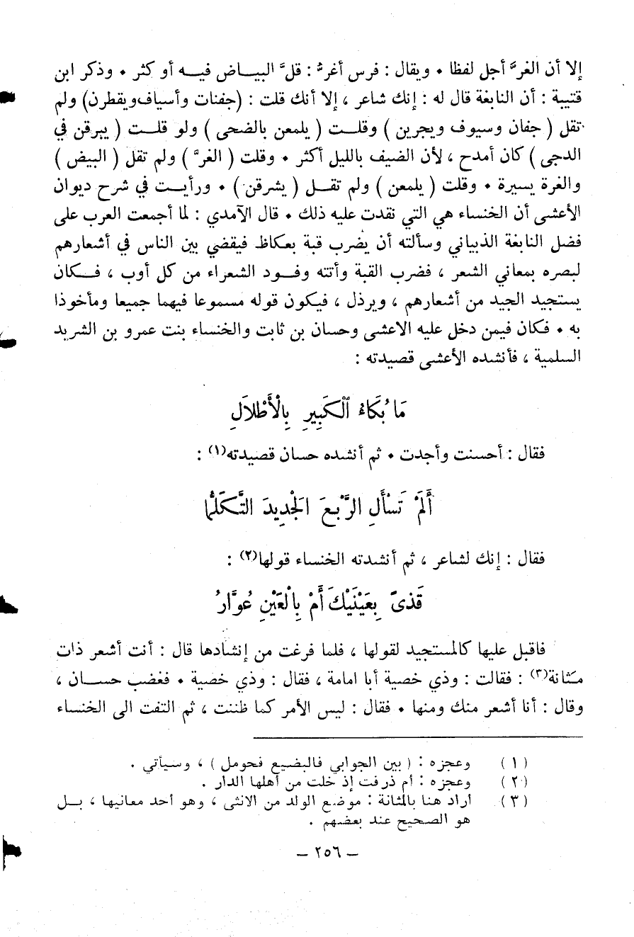 إلا أن الغرّ أجل لفظا. ويقال: فرس أغرّ: قلّ البياض فيه أو كثر. وذكر ابن قتيبة: أن النابغة قال له: إنك شاعر، إلا أنك قلت: (جفنات وأسياف ويقطرن) ولم تقل (جفان وسيوف ويجرين) وقلت (يلمعن بالضحى) ولو قلت (يبرقن في الدجى) كان أمدح، لأن الضيف بالليل أكثر. وقلت (الغرّ) ولم تقل (البيض) والغرة يسيرة. وقلت (يلمعن) ولم تقل (يشرقن). ورأيت في شرح ديوان الأعشى أن الخنساء هي التي نقدت عليه ذلك. قال الآمدي: لما أجمعت العرب على فضل النابغة الذبياني وسألته أن يضرب قبة بعكاظ فيقضي بين الناس في أشعارهم لبصره بمعاني الشعر، فضرب القبة وأتته وفود الشعراء من كل أوب، فكان يستجيد الجيد من أشعارهم، ويرذل، فيكون قوله مسموعا فيهما جميعا ومأخوذا به. فكان فيمن دخل عليه الأعشى وحسان بن ثابت والخنساء بنت عمرو بن الشريد السلمية، فأنشده الأعشى قصيدته: