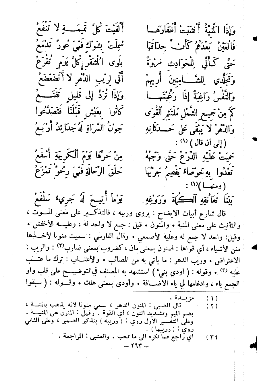 (¬2) قال الضبي: المنون الدهر، سمي منونا لانه يذهب بالمنة، بضم الميم وتشديد النون، أي القوة. وقيل: المنون هي المنية.