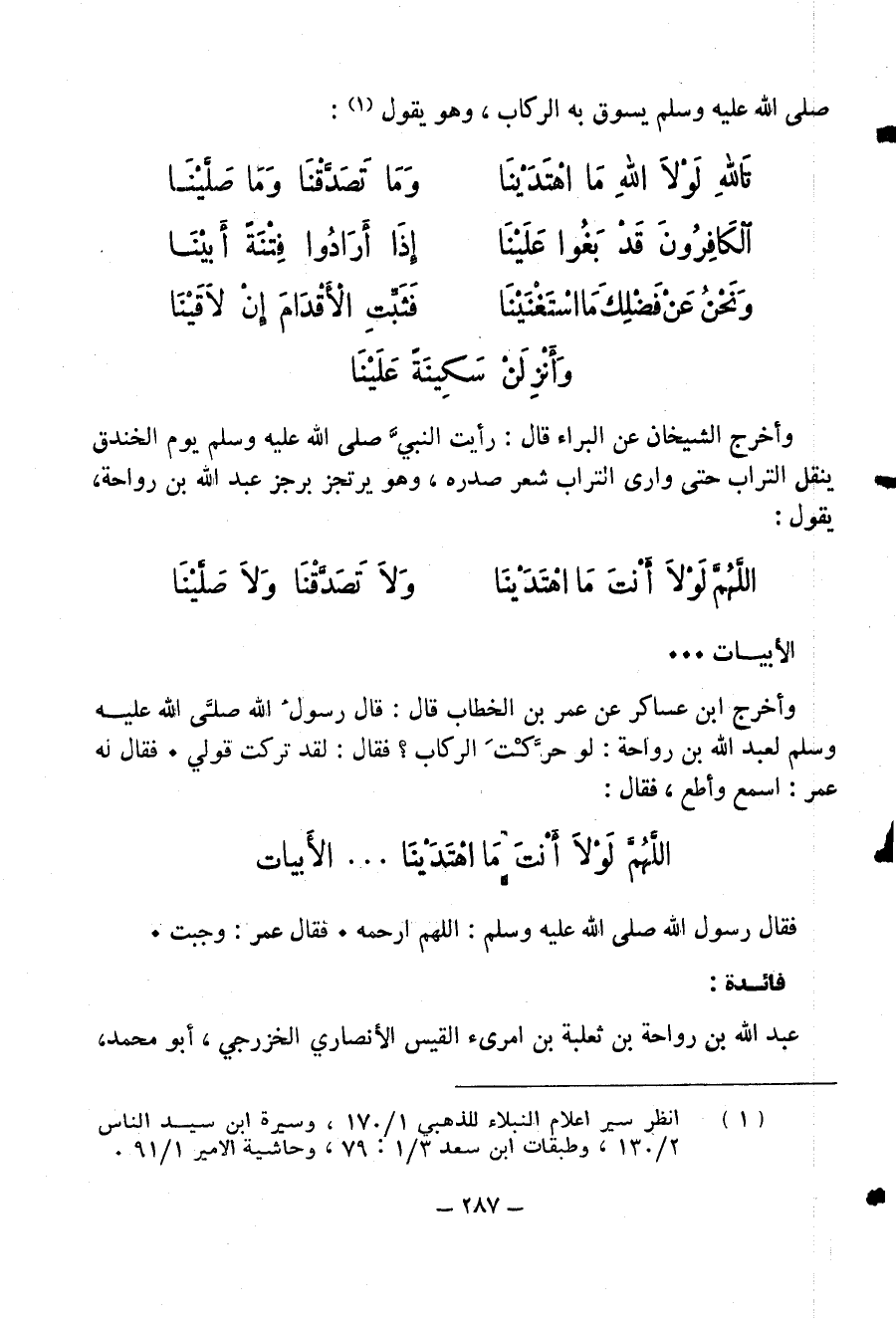 صدره، وهو يرتجز برجز عبد الله بن رواحة، يقول: