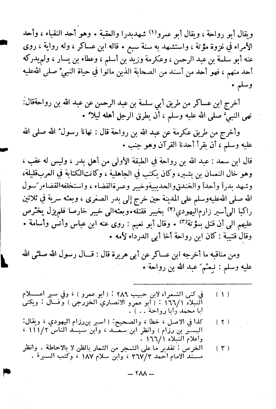 قال ابن سعد: عبد الله بن رواحة في الطبقة الأولى من أهل بدر، وليس له عقب، وهو خال النعمان بن بشير، وكان يكتب في الجاهلية، وكانت الكتابة في العرب قليلة، وشهد بدرا وأحدا والخندق والحديبية وخيبر وعمرة القضاء، واستخلفه القضاء رسول الله صلّى الله عليه وسلّم على المدينة حين خرج إلى بدر الصغرى، وبعثه سرية في ثلاثين راكبا الى أسير زارم اليهودي (¬2) بخيبر فقتله. وبعثه الى خيبر خارصا فلم يزل يخرص عليهم الى أن قتل