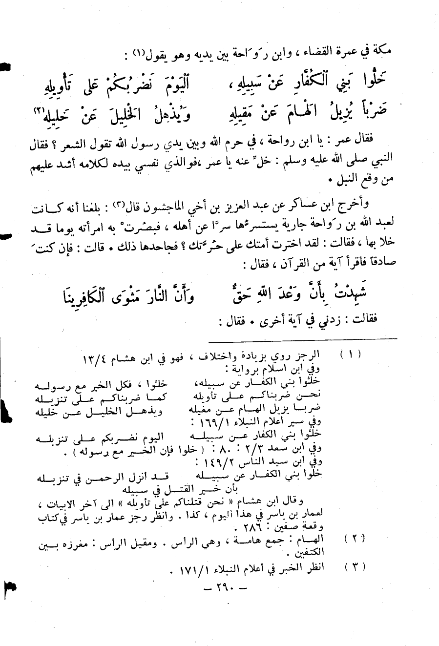 فقال عمر: يا ابن رواحة، في حرم الله وبين يدي رسول الله تقول الشعر؟ فقال النبي صلّى الله عليه وسلّم: خلّ عنه يا عمر، فو الذي نفسي بيده لكلامه أشد عليهم من وقع النبل.