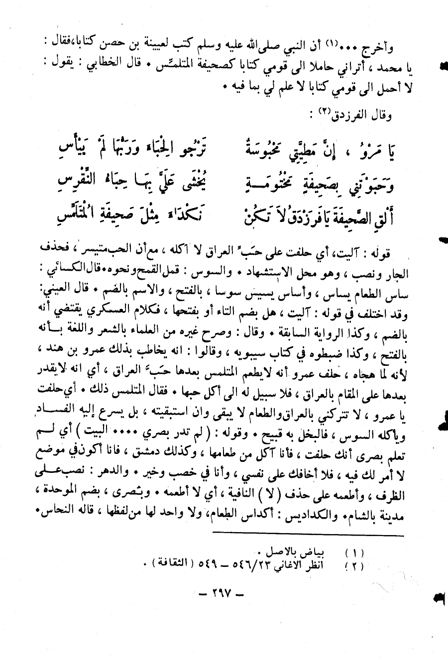 وقد اختلف في قوله: آليت، هل بضم التاء أو بفتحها، فكلام العسكري يقتضي أنه بالضم، وكذا الرواية السابقة. وقال: وصرح غيره من العلماء بالشعر واللغة بأنه بالفتح، وكذا ضبطوه في كتاب سيبويه، وقالوا: انه يخاطب بذلك عمرو بن هند، لأنه لما هجاه، حلف عمرو أنه لا يطعم المتلمس بعدها حبّ العراق، أي انه لا يقدر بعدها على المقام بالعراق، فلا سبيل له الى أكل حبها. فقال المتلمس ذلك. أي حلفت يا عمرو، لا تتركني بالعراق والطعام لا يبقى وان استبقيته، بل يسرع إليه الفساد ويأكله السوس، فالبخل به قبيح. وقوله: (لم تدر بصري ... البيت) أي لم تعلم بصرى أنك حلفت، فأنا آكل من طعامها، وكذلك دمشق، فانا أكون في موضع لا أمر لك فيه، فلا أخافك على نفسي، وأنا في خصب وخير. والدهر: نصب على الظرف، وأطعمه على حذف (لا) النافية، أي لا أطعمه. وبصرى، بضم الموحدة، مدينة بالشام. والكداديس: أكداس الطعام، ولا واحد لها من لفظها، قاله النحاس.