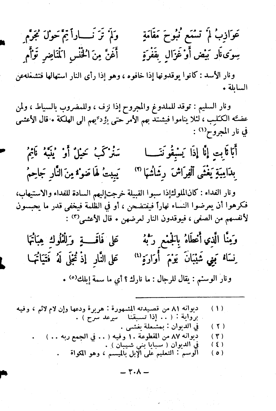 ونار الفداء: كان الملوك إذا سبوا القبيلة خرجت إليهم السادة للفداء والاستيهاب، فكرهوا أن يعرضوا النساء نهارا فيفتضحن، أو في الظلمة فيخفى قدر ما يحبسون لأنفسهم من الصفى، فيوقدون النار لعرضهن. قال الأعشى (¬3):