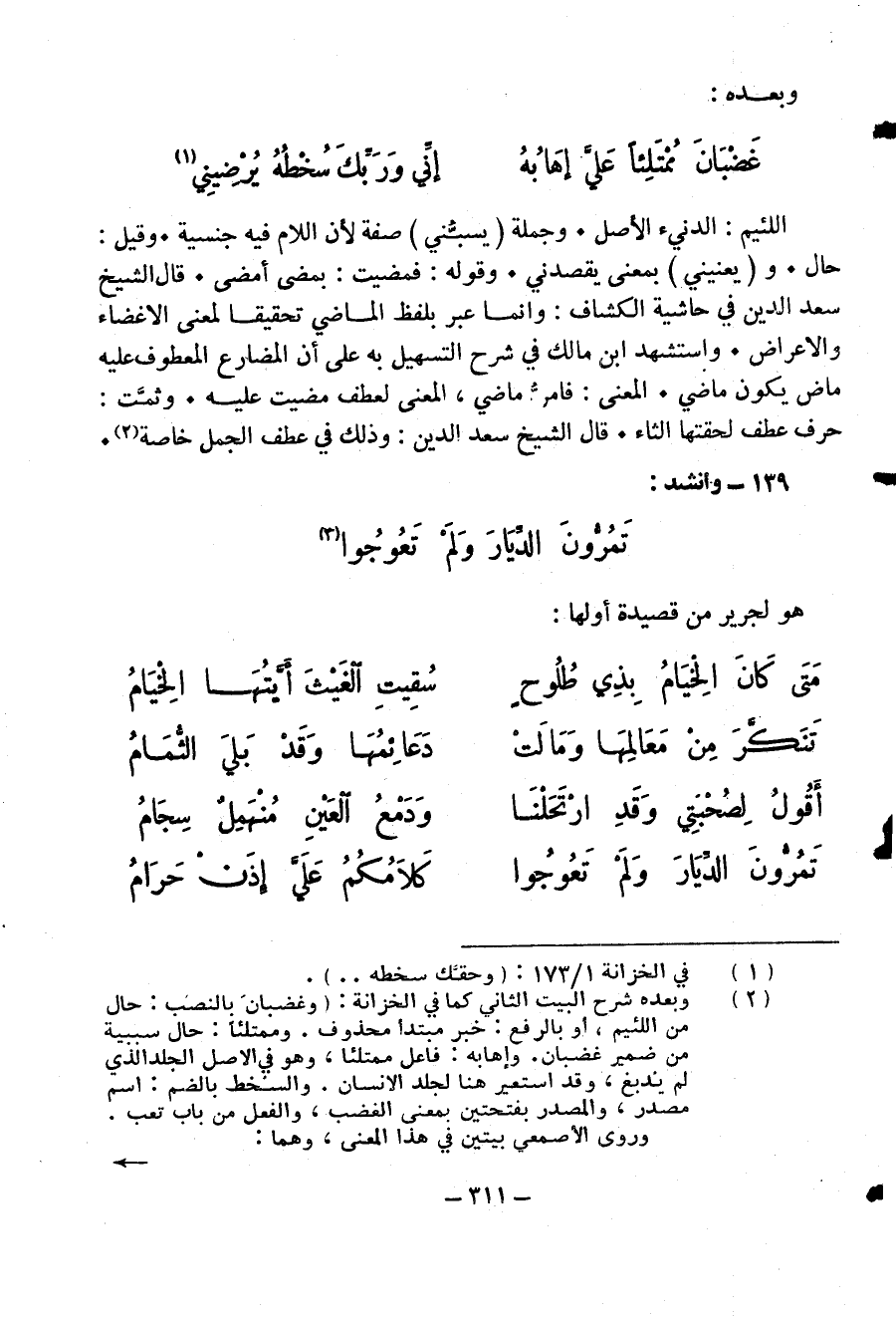 (¬2) وبعده شرح البيت الثاني كما في الخزانة: (وغضبان بالنصب: حال من اللئيم، أو بالرفع: خبر مبتدأ محذوف. وممتلئا: حال سببية من ضمير غضبان. وإهابه: فاعل ممتلئا، وهو في الاصل الجلد الذي لم يدبغ، وقد استعير هنا لجلد الانسان. والسخط بالضم: اسم مصدر، والمصدر بفتحتين بمعنى الغضب، والفعل من باب تعب.