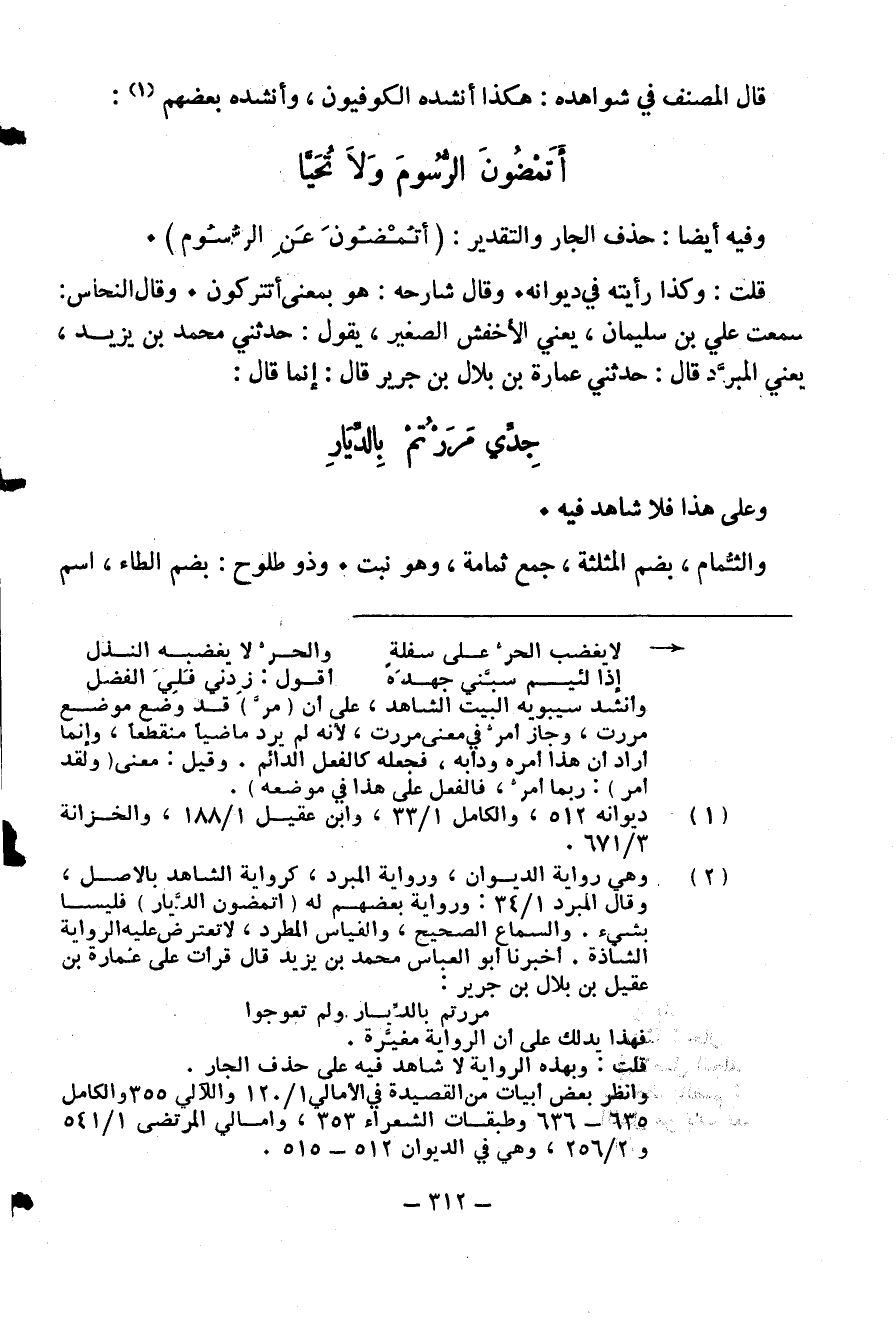 (¬2) وهي رواية الديوان، ورواية المبرد، كرواية الشاهد بالاصل، وقال المبرد 1/ 34: ورواية بعضهم له (اتمضون الدّيار) فليسا بشيء. والسماع الصحيح، والقياس المطرد، لا تعترض عليه الرواية الشاذة. أخبرنا أبو العباس محمد بن يزيد قال قرأت على عمارة بن عقيل بن بلال بن جرير: