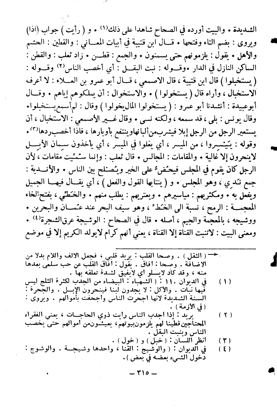 جمع ندي، وهو المجلس. و (ينتابها القول والفعل)، أي يقال فيها الجميل ويفعل به. ومكثريهم: مياسيرهم. ويعتريهم: يطلب منهم. والخطّي، بفتح الخاء المعجمة: الرمح، نسبة الى الخطّ، وهو سيف البحر عند عمان والبحرين.